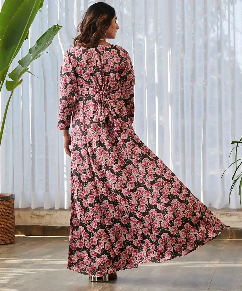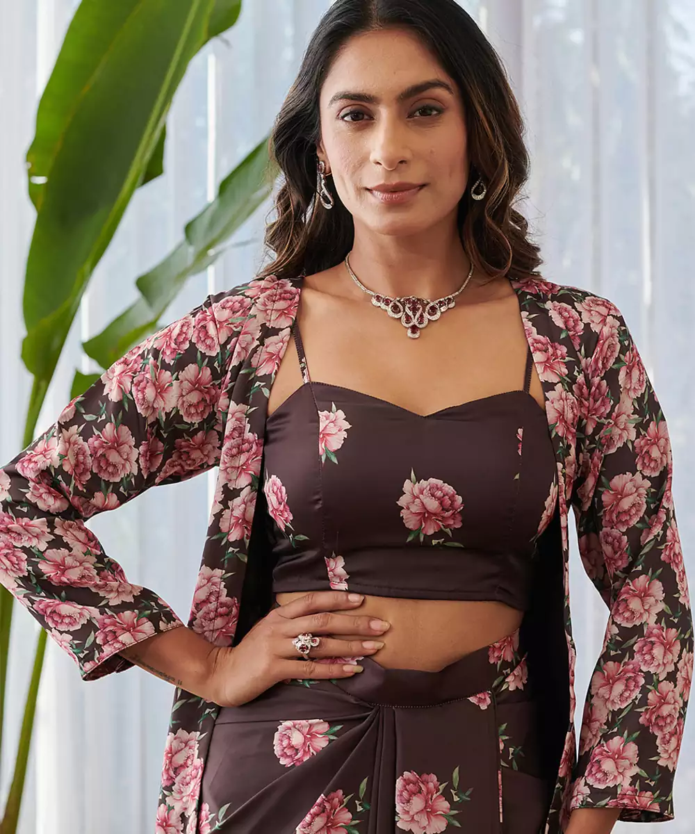 This Dark Brown Printed Satin Fusion Co Ord Set Offers A Sophisticated Blend Of Rich Color And Modern Style. The Lustrous Satin Fabric Drapes Gracefully While The Elegant Prints Add Visual Appeal. Ideal For Festive Gatherings And Stylish Celebrations.