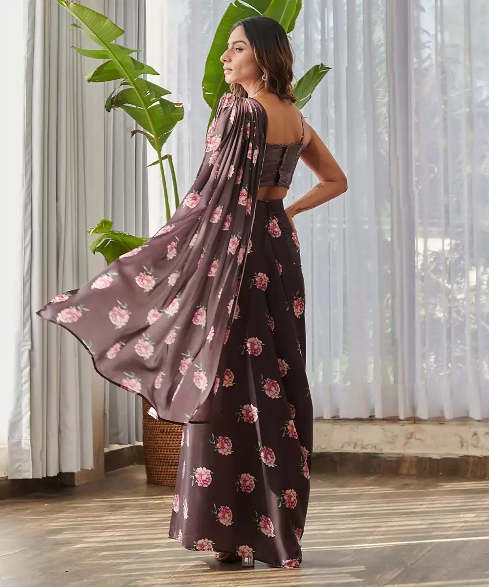 Dark Brown Printed Swiss Satin Saree Set