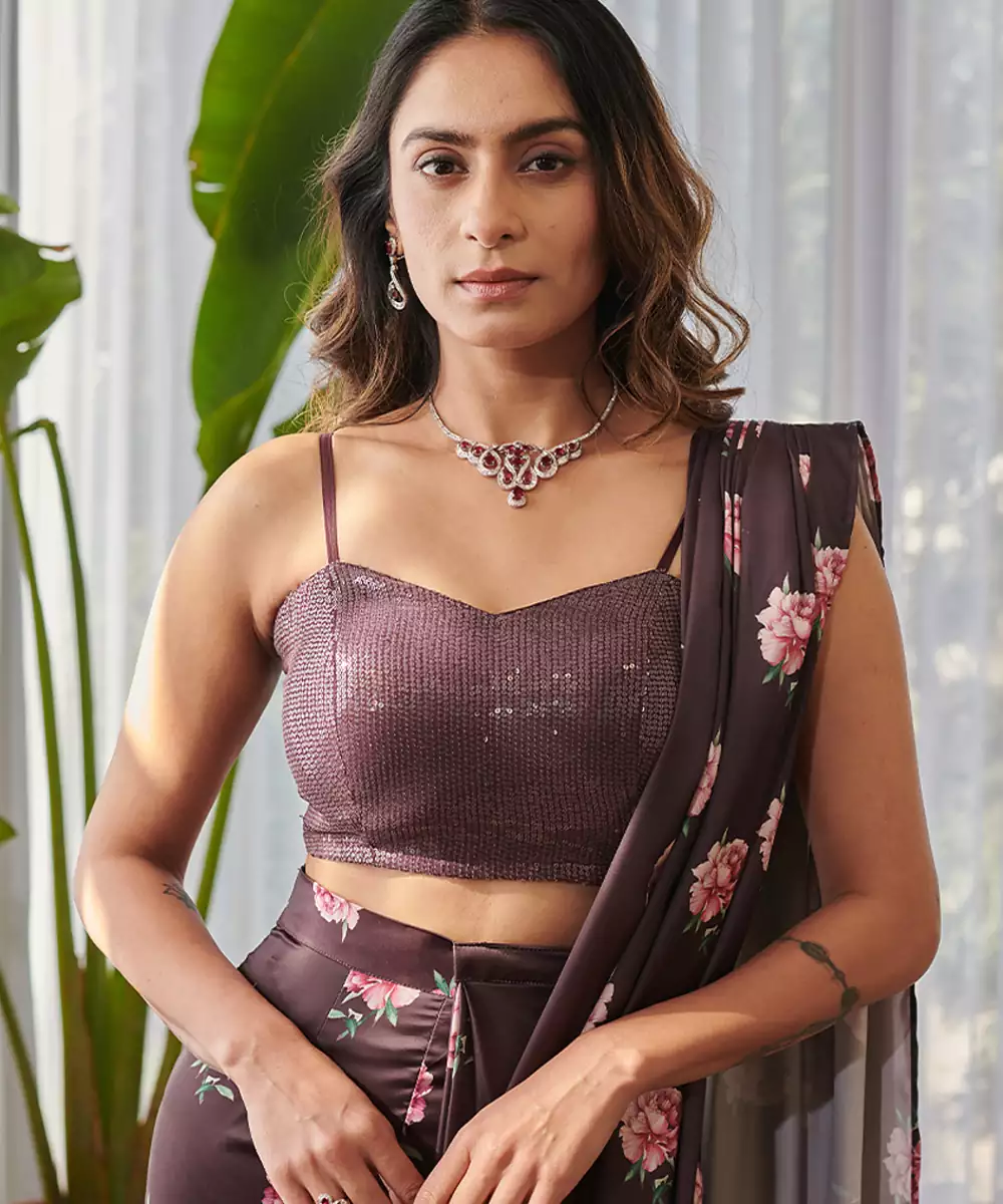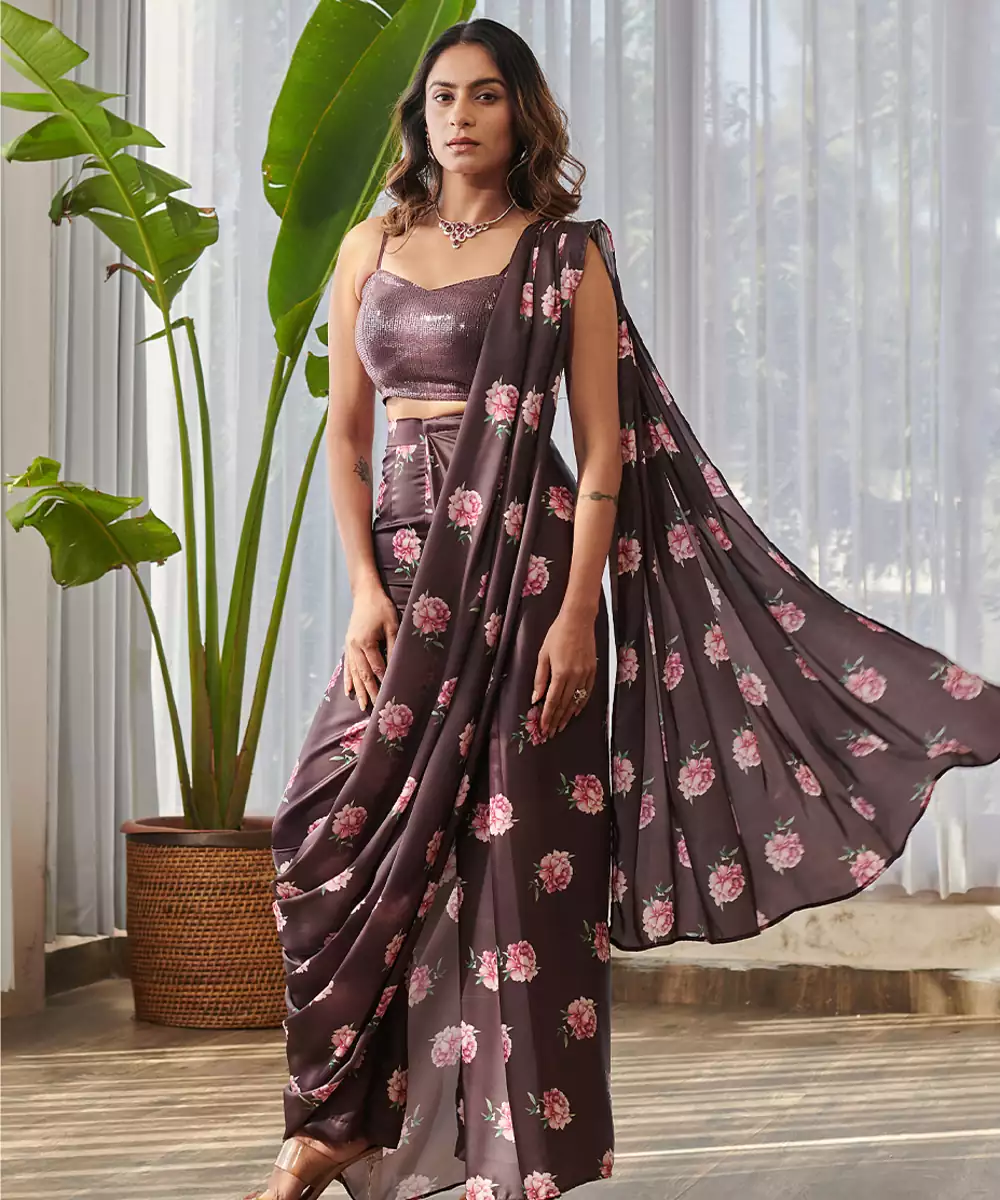 This Dark Brown Printed Swiss Satin Saree Set Showcases Rich Tones And Elegant Prints For A Sophisticated Ethnic Look. The Luxurious Satin Fabric Drapes Beautifully While Adding A Subtle Sheen. Paired With A Coordinated Blouse, It Is Perfect For Festive Gatherings, Celebrations, And Evening Occasions.
