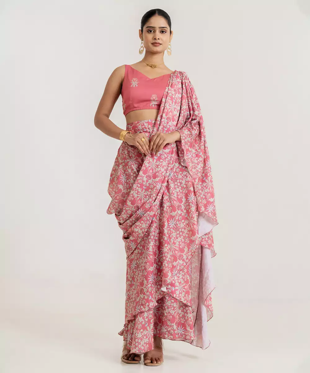 Bright And Graceful, This Dusty Rose Tiered Saree Set Features A Soft Sheen With A Fluid Drape. The Delicate Print Enhances Its Charm, Making It Perfect For Festive And Daytime Occasions. A Stylish Ensemble That Blends Femininity With Modern Elegance Beautifully.