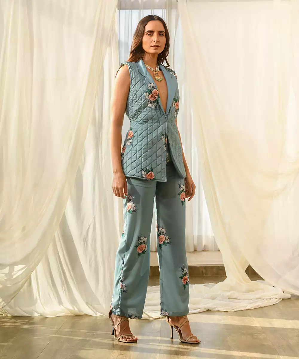 Aqua Blue Floral Embellished Lehenga Set With Leheriya Dupatta