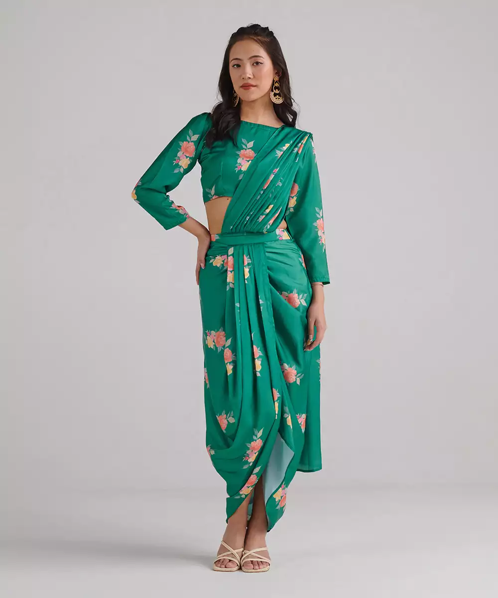 Featuring Jade Green Floral Top Featuring Elegant 3/4 Th Puff Sleeves. Paired Perfectly With A Draped Skirt Saree, This Ensemble Blends Traditional Charm With Modern Flair. Ideal For Any Occasion