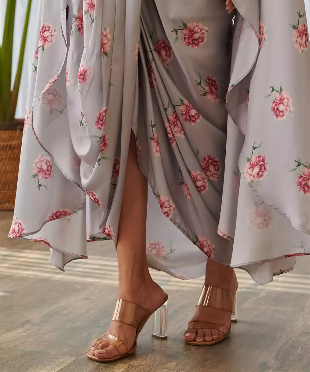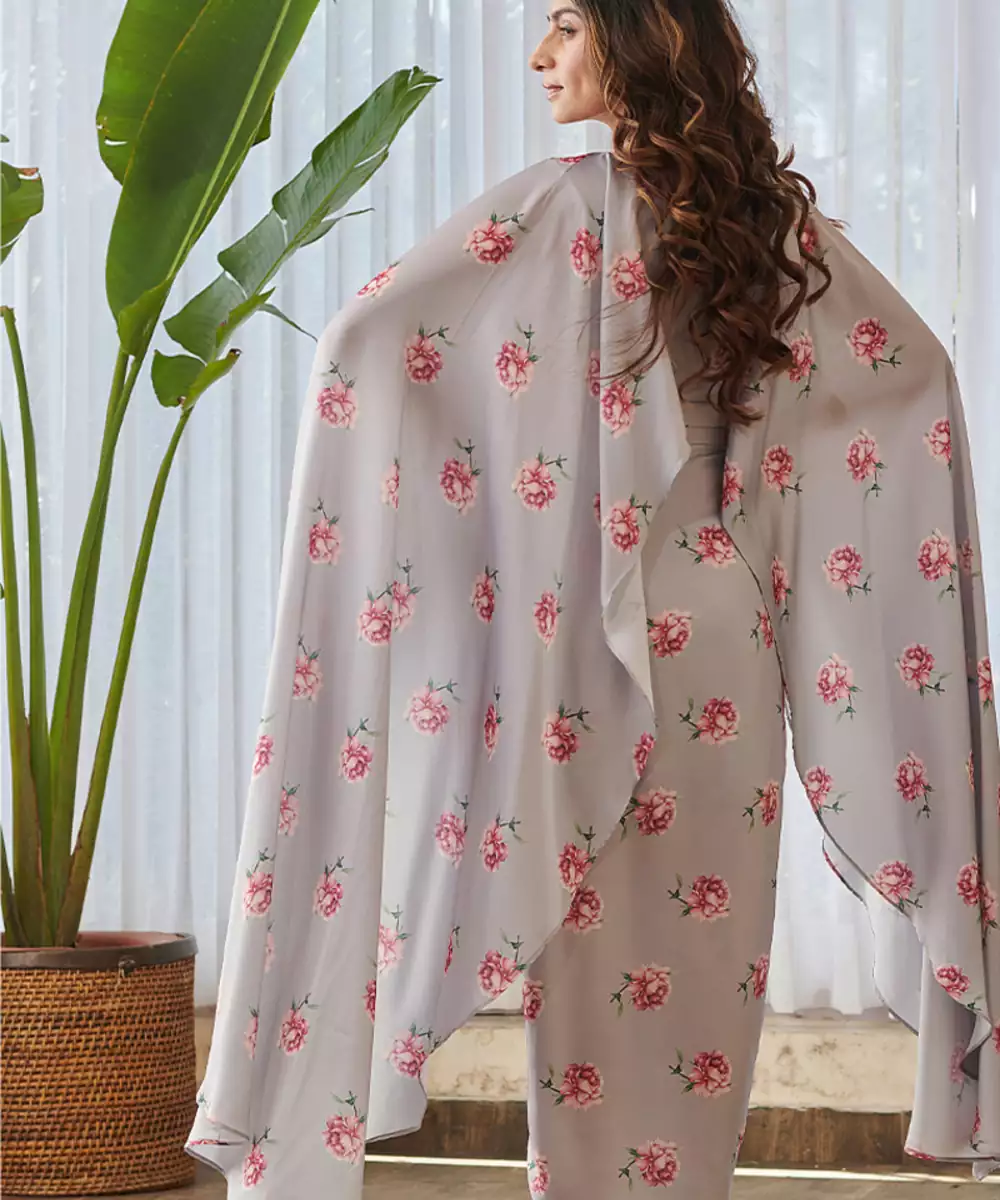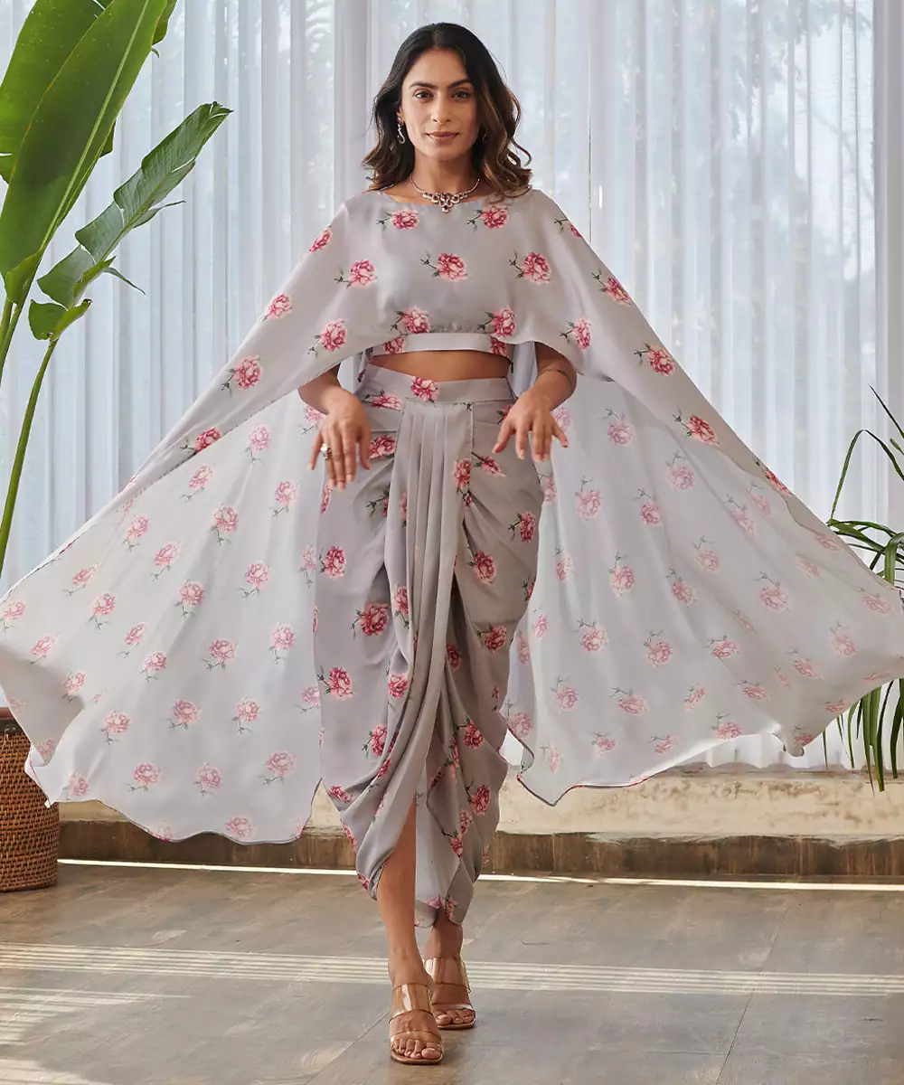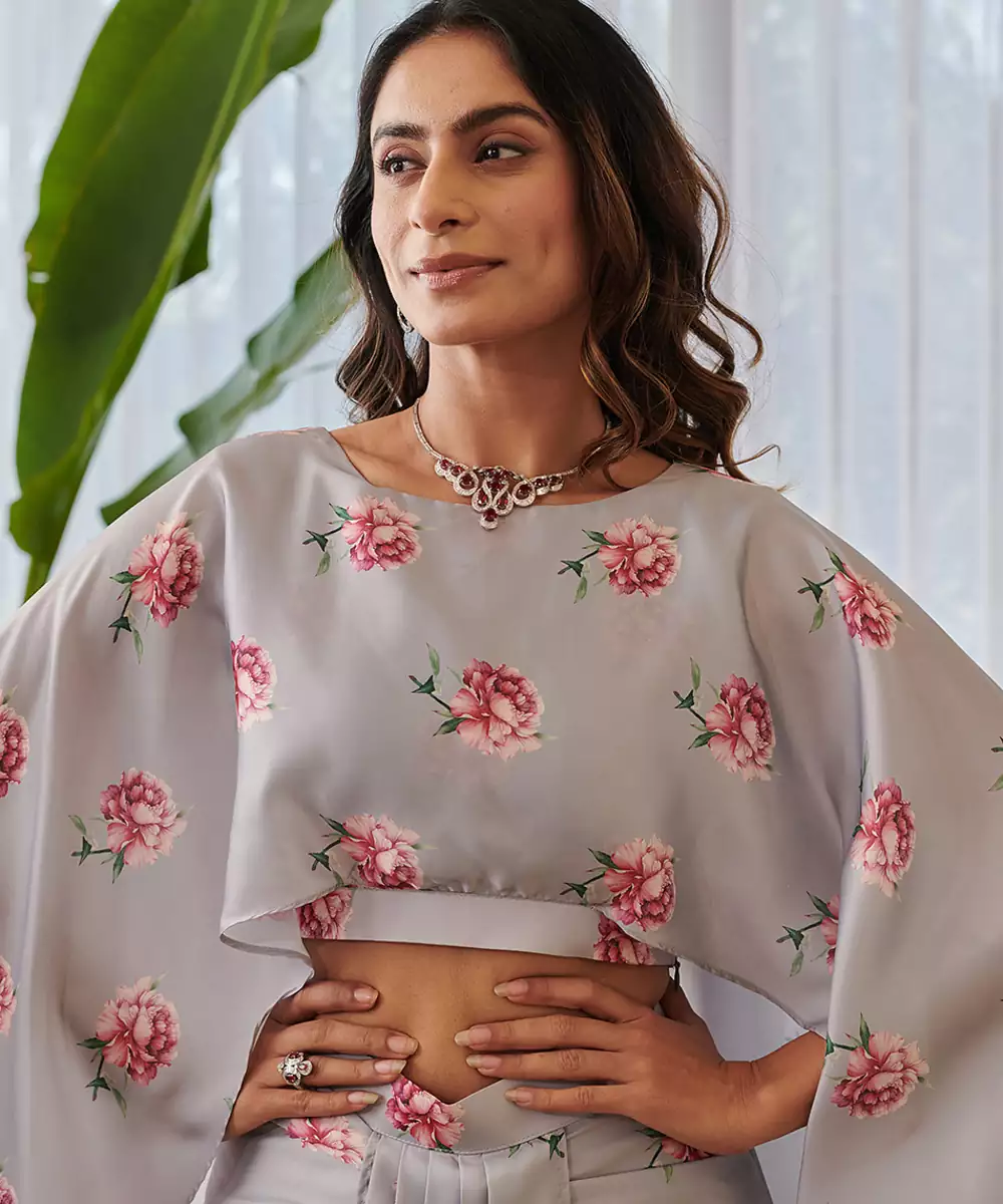 This Grey Printed Satin Fusion Co Ord Set Blends Modern Fashion With Ethnic Inspiration. The Smooth Satin Fabric Adds A Luxurious Shine While The Stylish Prints Enhance Its Contemporary Appeal. Perfect For Festive Gatherings, Celebrations, And Fashionable Events.