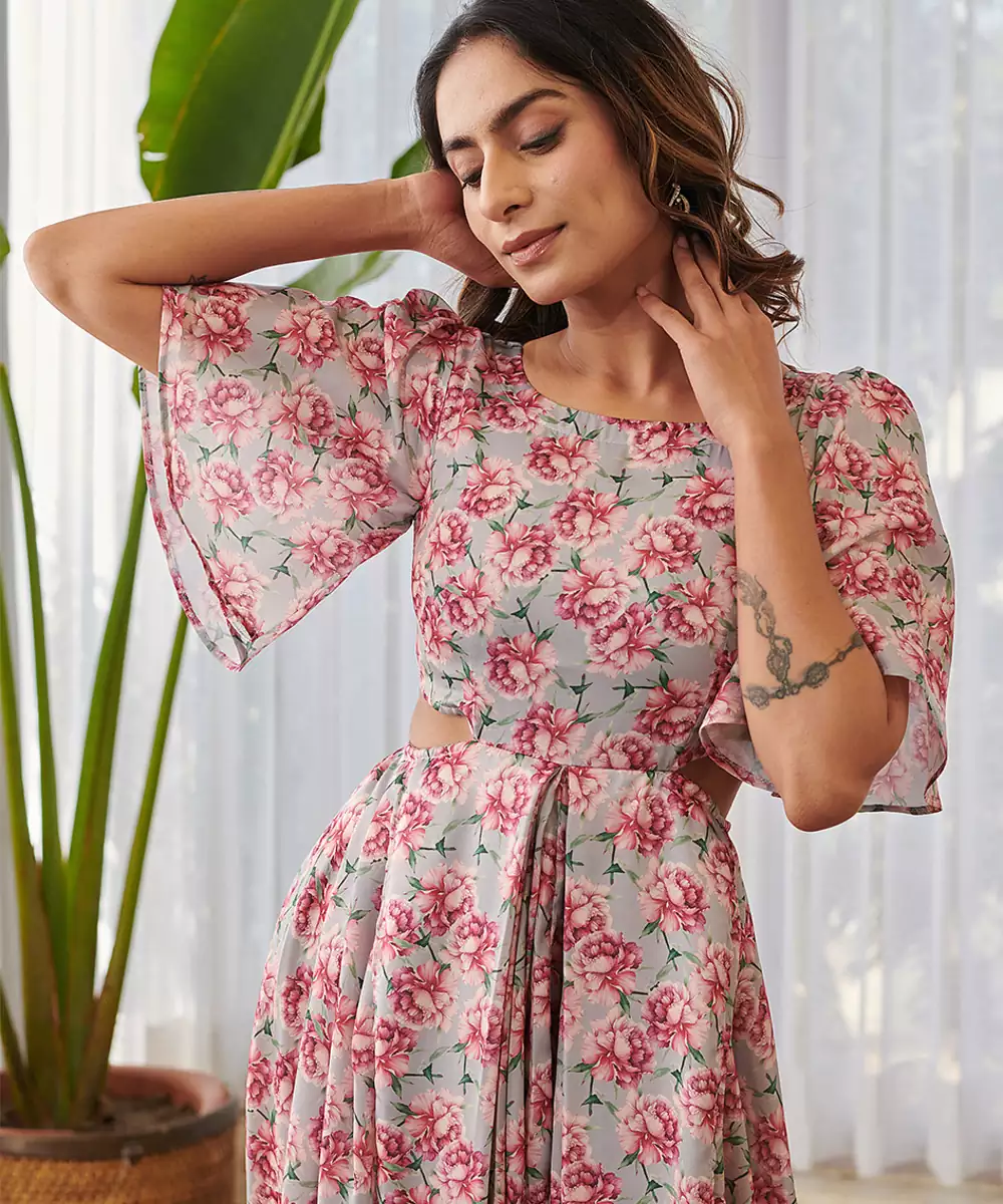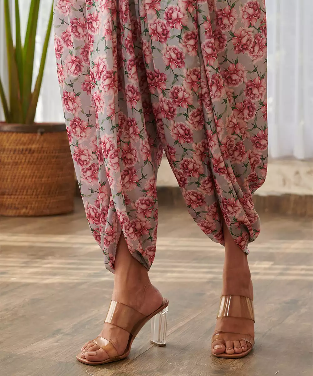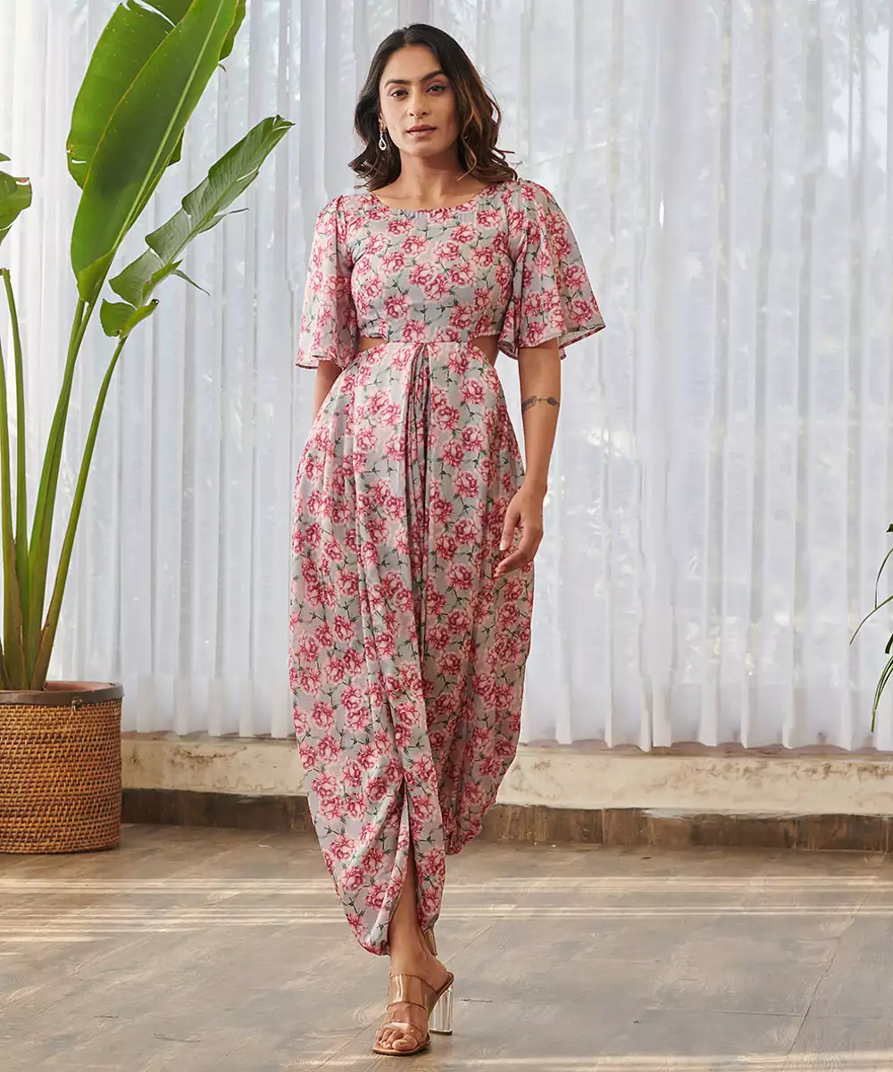 This Grey Printed Swiss Satin Jumpsuit Combines Sleek Elegance With Contemporary Design. The Smooth Satin Fabric Adds A Subtle Sheen While Ensuring A Graceful Drape. The Stylish Prints Elevate Its Appeal, Making It Ideal For Parties, Festive Gatherings, And Evening Occasions.
