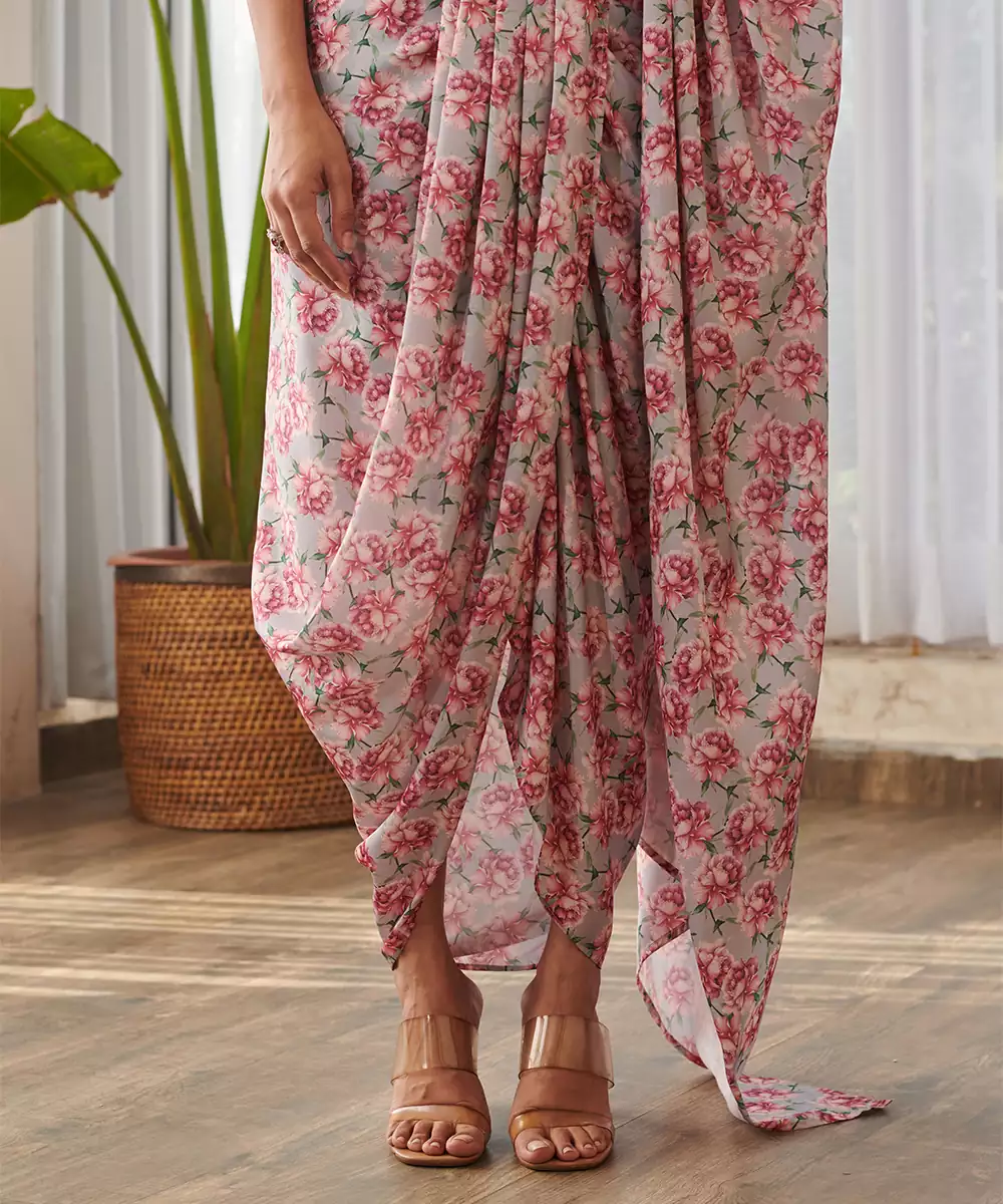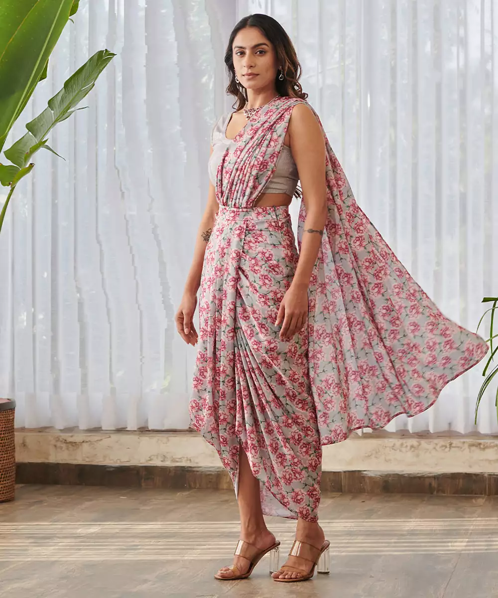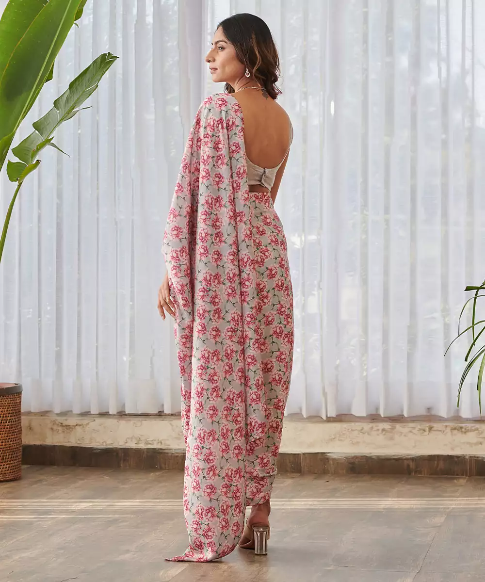 Pale Grey Printed Swiss Satin Saree Set
