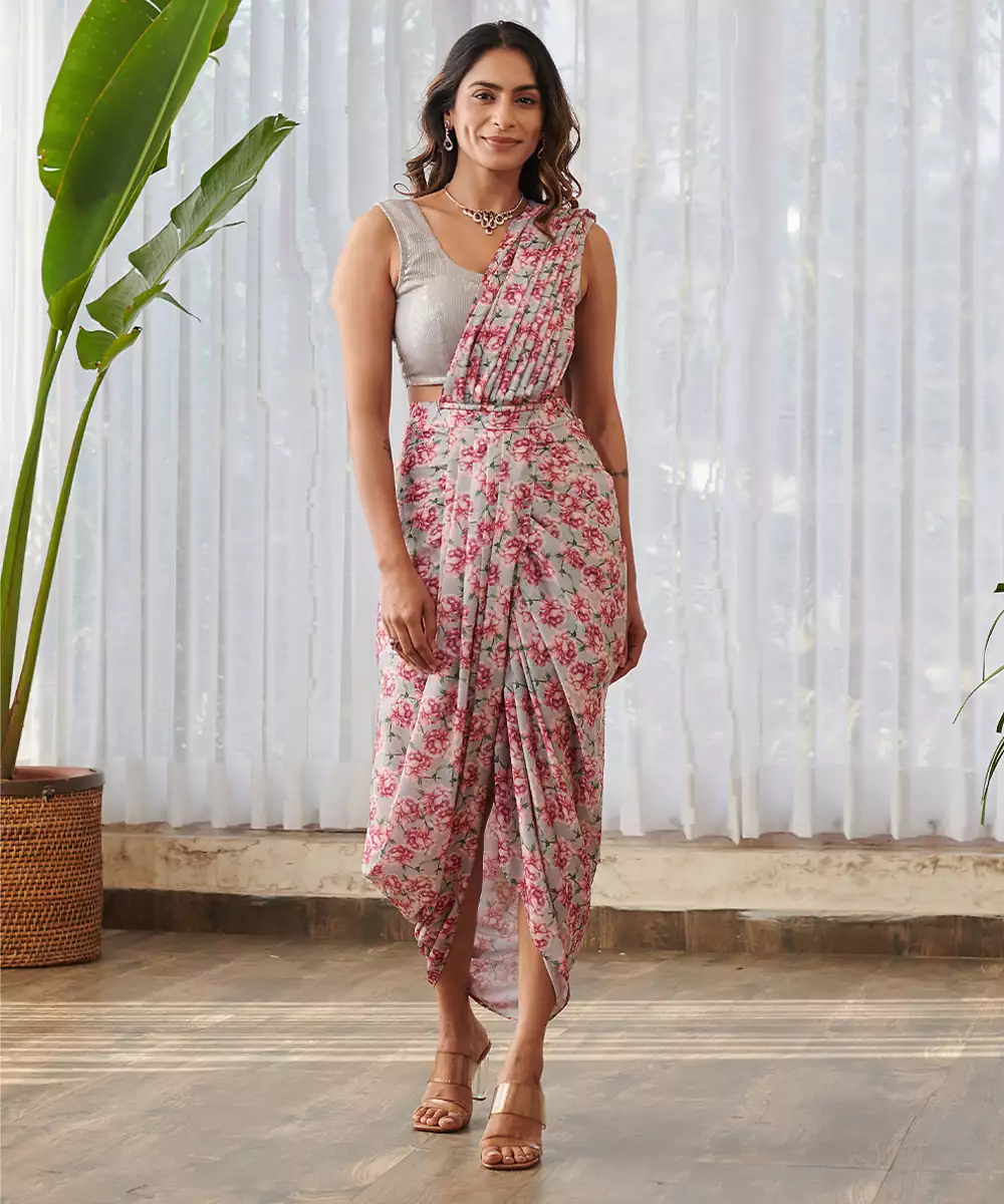 This Pale Grey Printed Swiss Satin Saree Set Reflects Subtle Sophistication And Contemporary Style. The Smooth Satin Fabric Offers A Luxurious Sheen While Elegant Prints Enhance Its Graceful Look. Styled With A Matching Blouse, It Is Ideal For Festive Occasions, Formal Gatherings, And Elegant Evening Events.