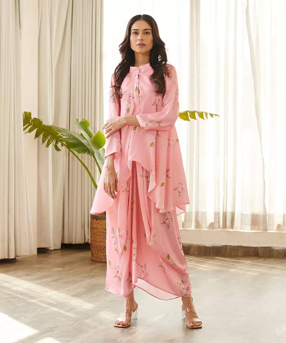 Featuring A Look Radiant At Your Haldi And Mehendi Functions With Our Taffy Pink Dhoti Kurti Dress. Crafted For Comfort And Style, This Adjustable Size Ensemble Effortlessly Blends Tradition With Modern Flair. Embrace The Festivities In Elegance And Grace.