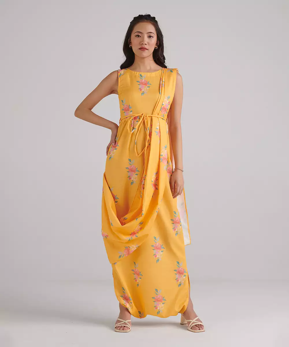 Featuring A Yellow Jumpsuit Featuring Floral Pattern All Over With An Attached Front Drape.