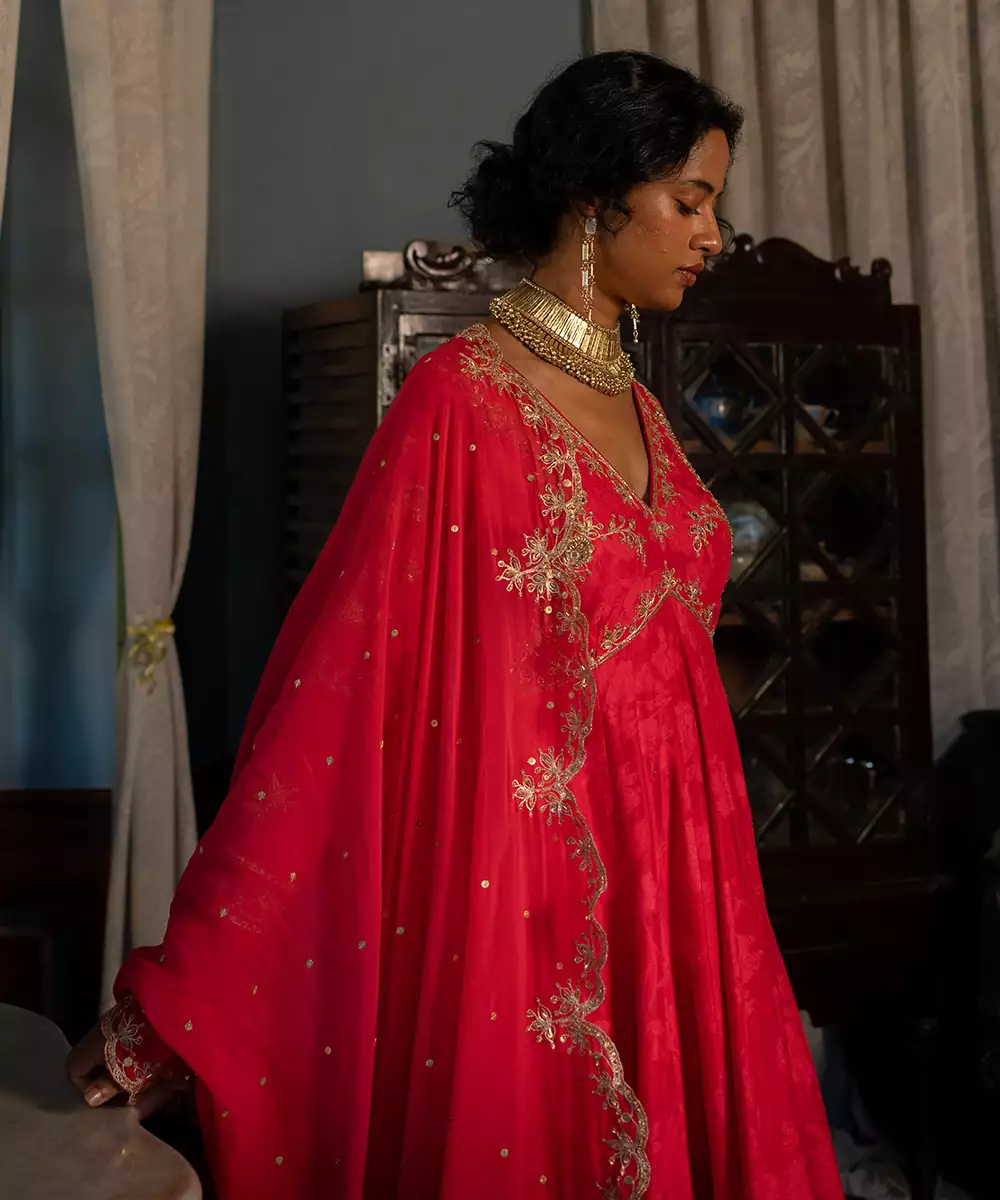 Featuring Woven Russian Jacquard Embroidered Anarkali Paired With Pants And Organza Dupatta Both Heavily Embellished With Antique Gold Tone Work.