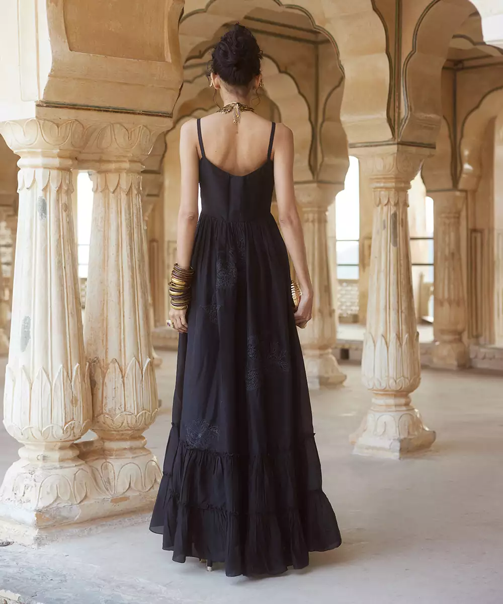 Featuring The Easy Breezy Noodle Strape Maxi Dress Is An Event Ready Style With Zero Hassle. Our Black Noodle Strape Maxi Is Crafted In Pure Silk Organza Fabric And It Has Floral Motif Cutwork Technique.