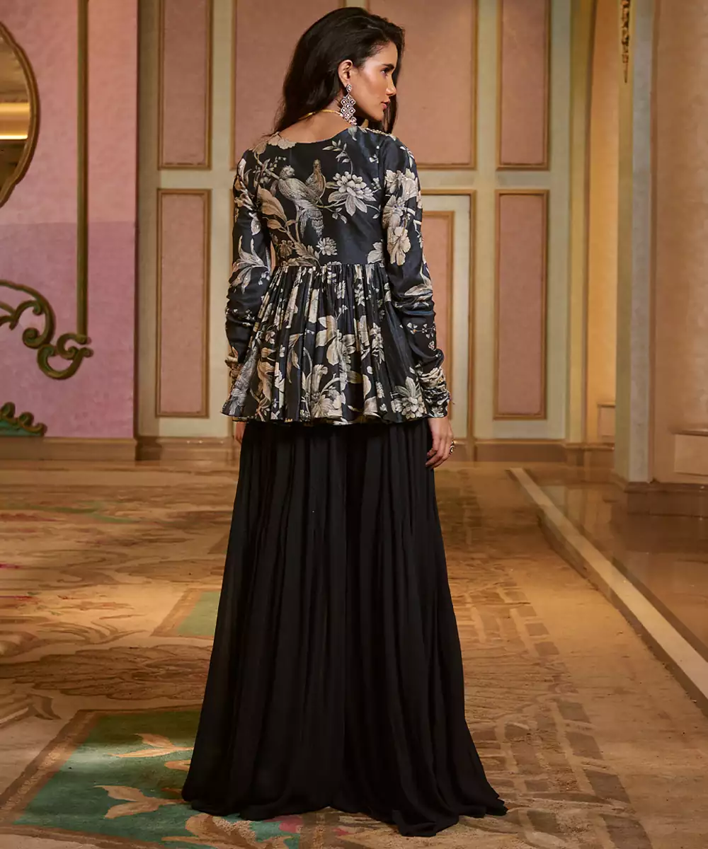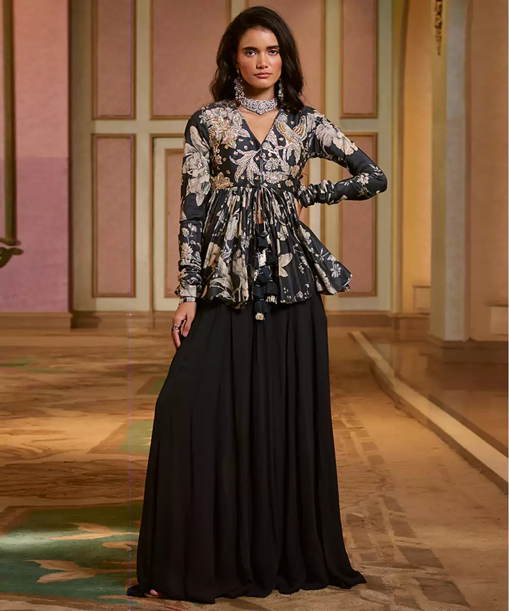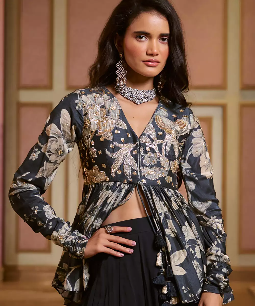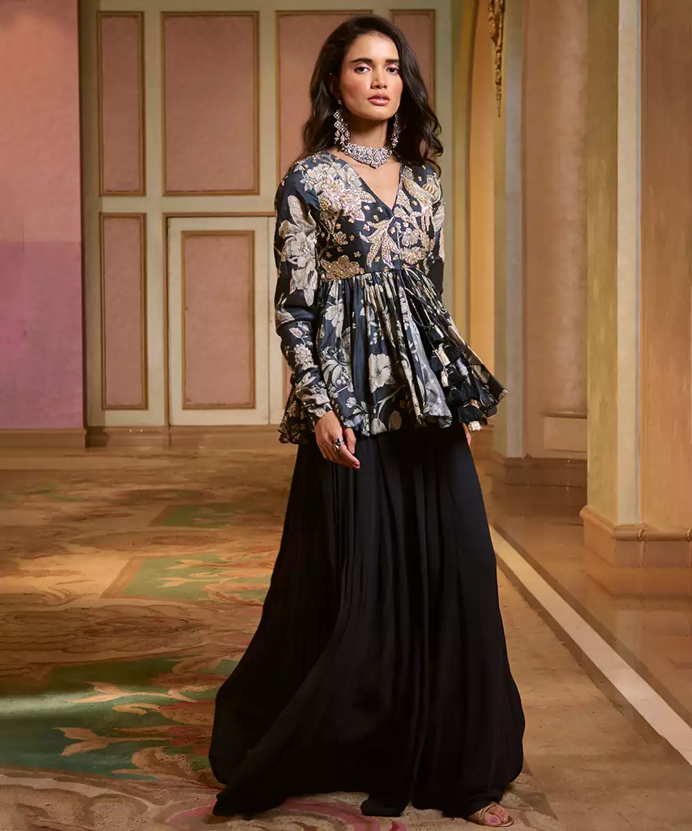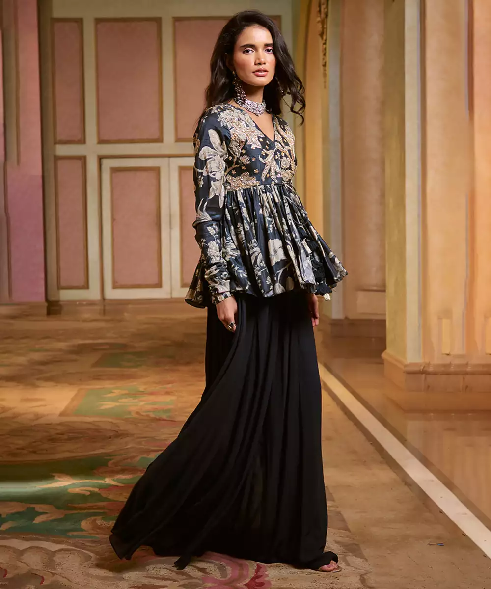A Navy Blue Floral Printed Peplum Set Featuring A Flattering V Neckline And A Hand Embroidered Yoke That Lends Artisanal Charm. The Churri Sleeves Are Delicately Embroidered, Enhancing The Silhouette With Subtle Depth And Elegance. A Drawstring Waist With Tassel Detailing Adds Definition, While Solid Palazzos Complete The Look With A Balance Of Ease And Festive Flair.