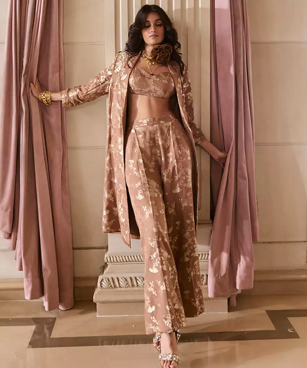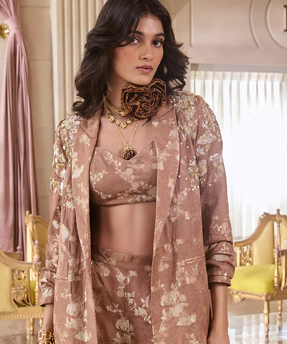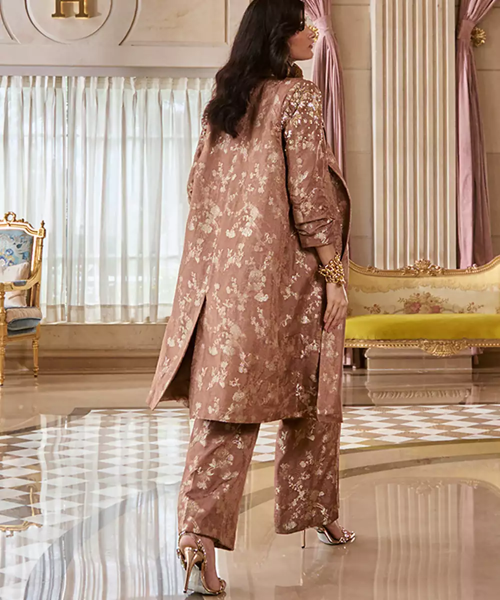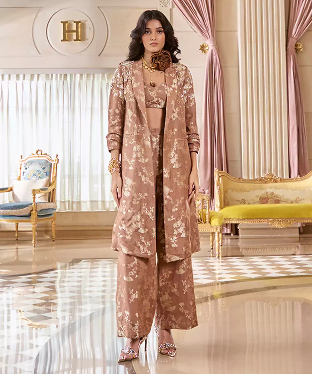 A Fresh Addition To Our Festive Lineup Elevate Your Festive Style With This Elegant Jacquard Co Ord Set, Featuring Tailored Pants, A Refined Blouse, And A Statement Jacket Adorned With Intricate Hand Embroidery. This Versatile Ensemble Blends Traditional Craftsmanship With Modern Structure.