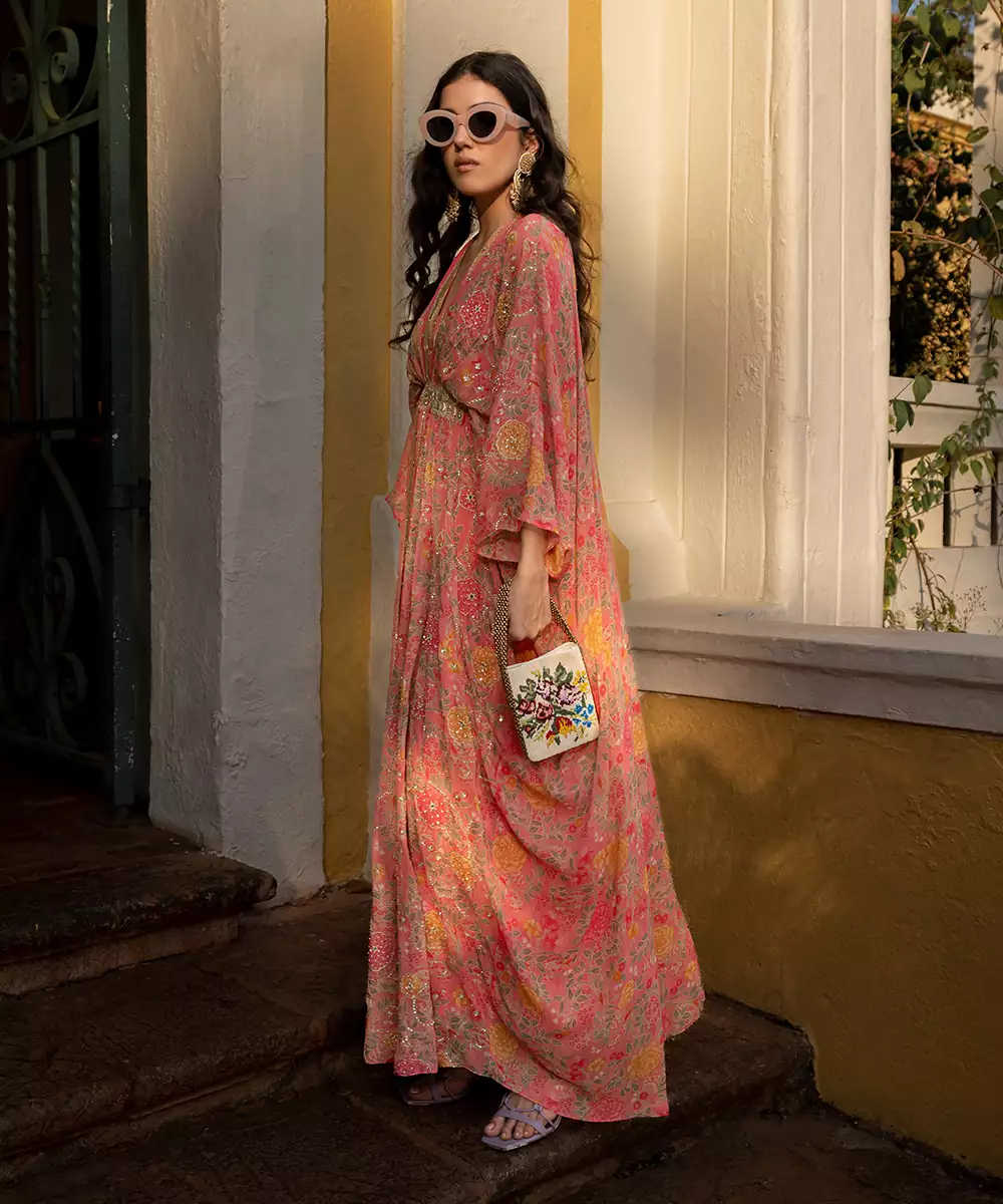 Featuring A Blooming Floral And Multi Color Stripes With Dainty Printed Motifs Kaftan. It Is Sprinkled Using Zari, Floral Sequins And Mirror.