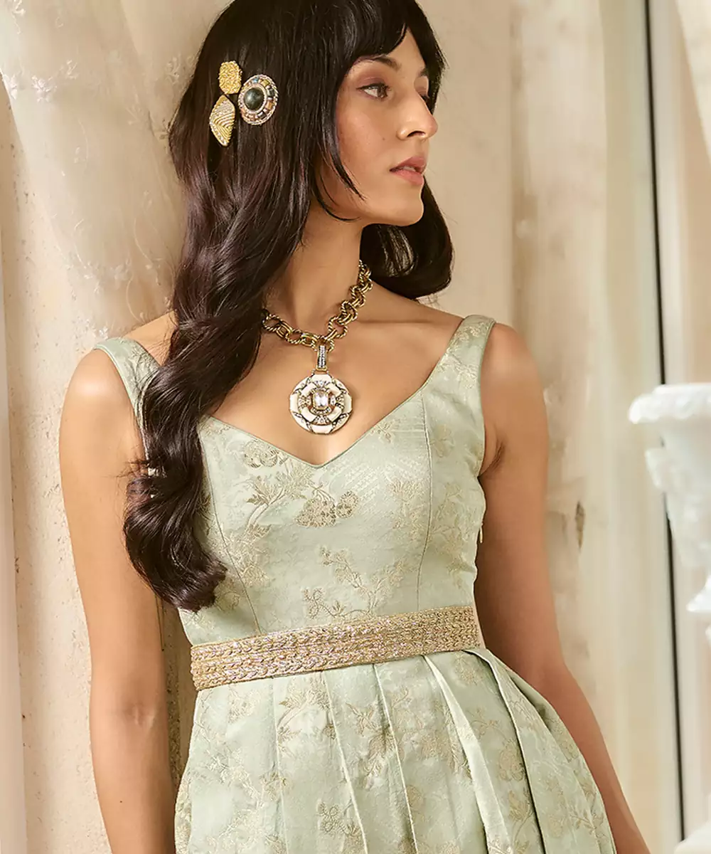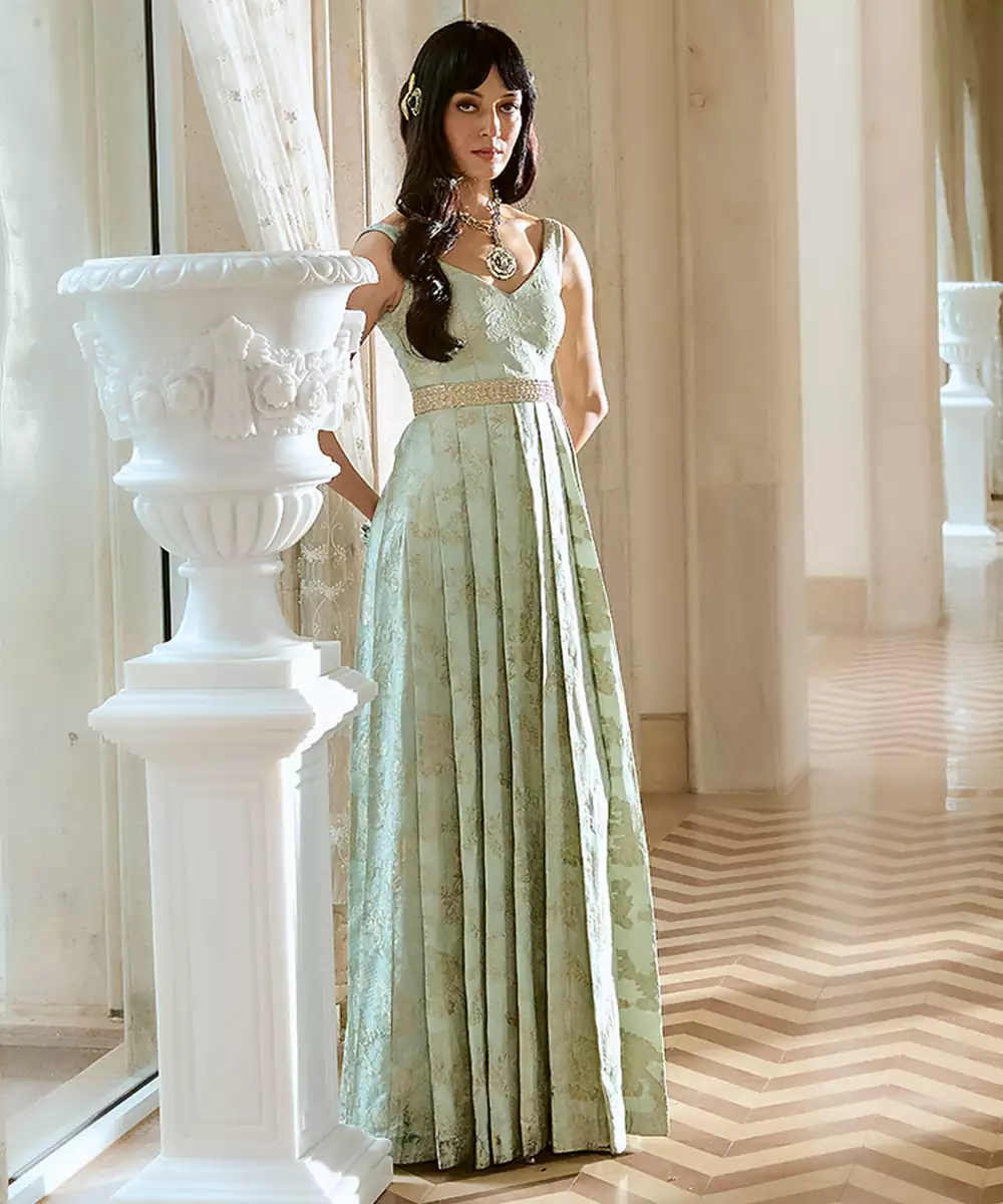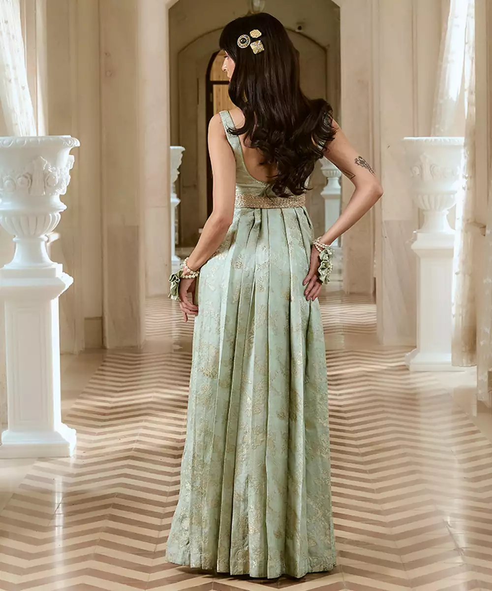 A Turquoise Blue Strapped Gown Crafted In Luxurious Silver Jacquard. The Silhouette Features A Finely Pleated Lower Half That Adds Graceful Movement, While The Waist Is Cinched With A Hand Embroidered Zardozi Belt—Adding A Touch Of Ornate Elegance To The Contemporary Form