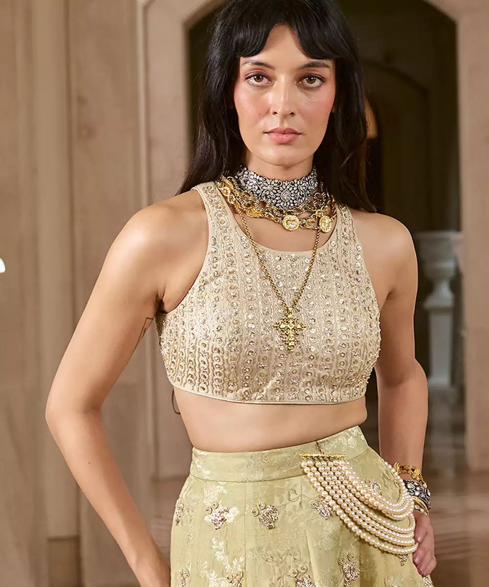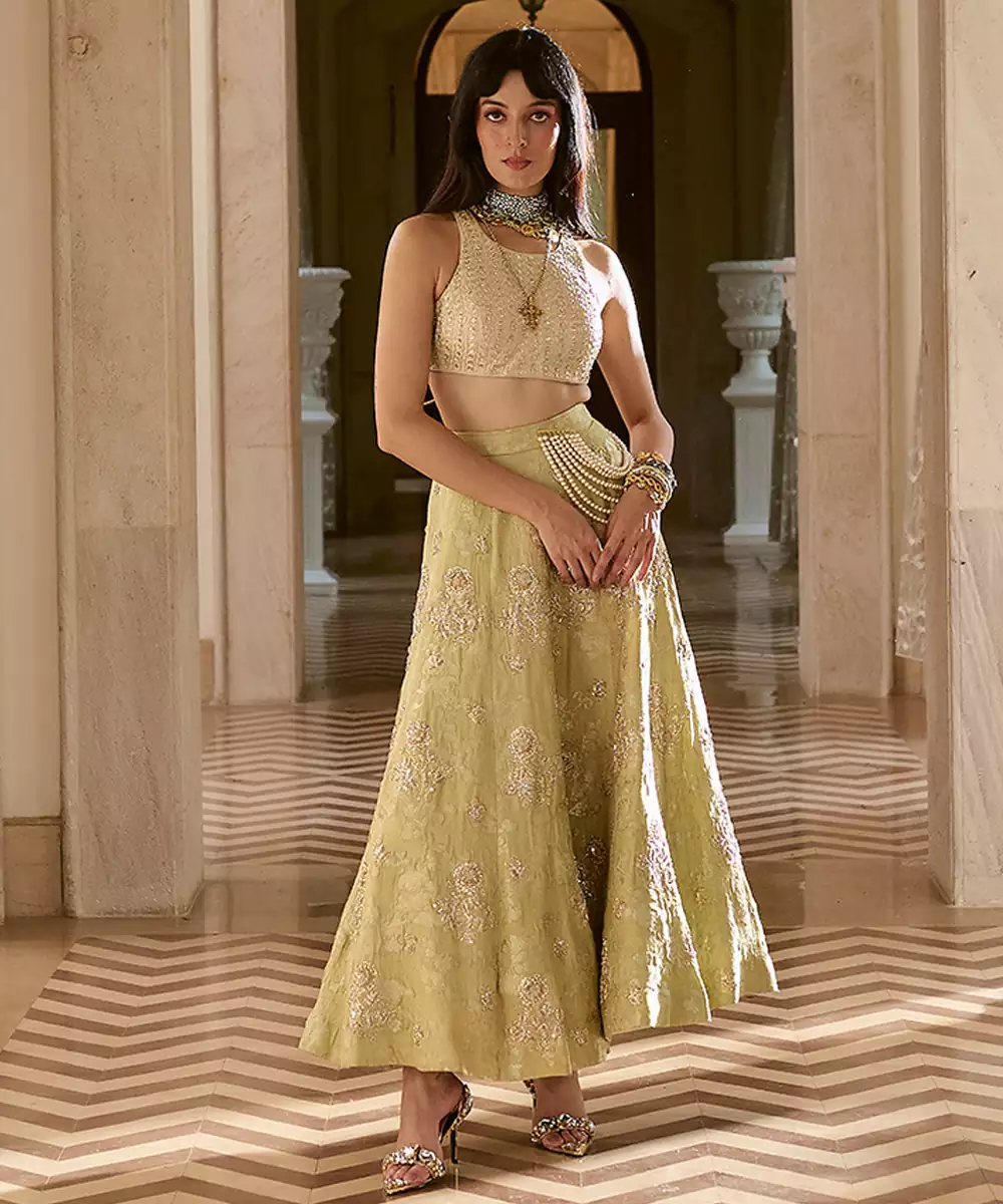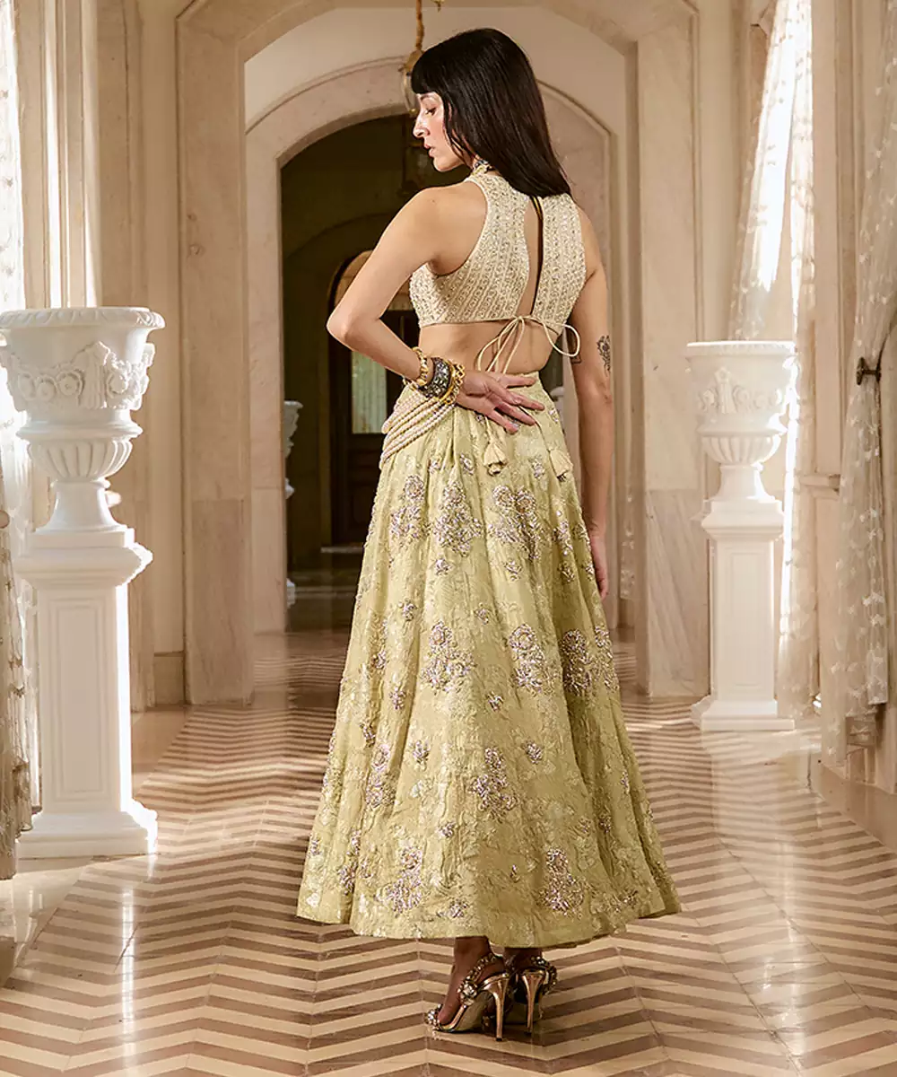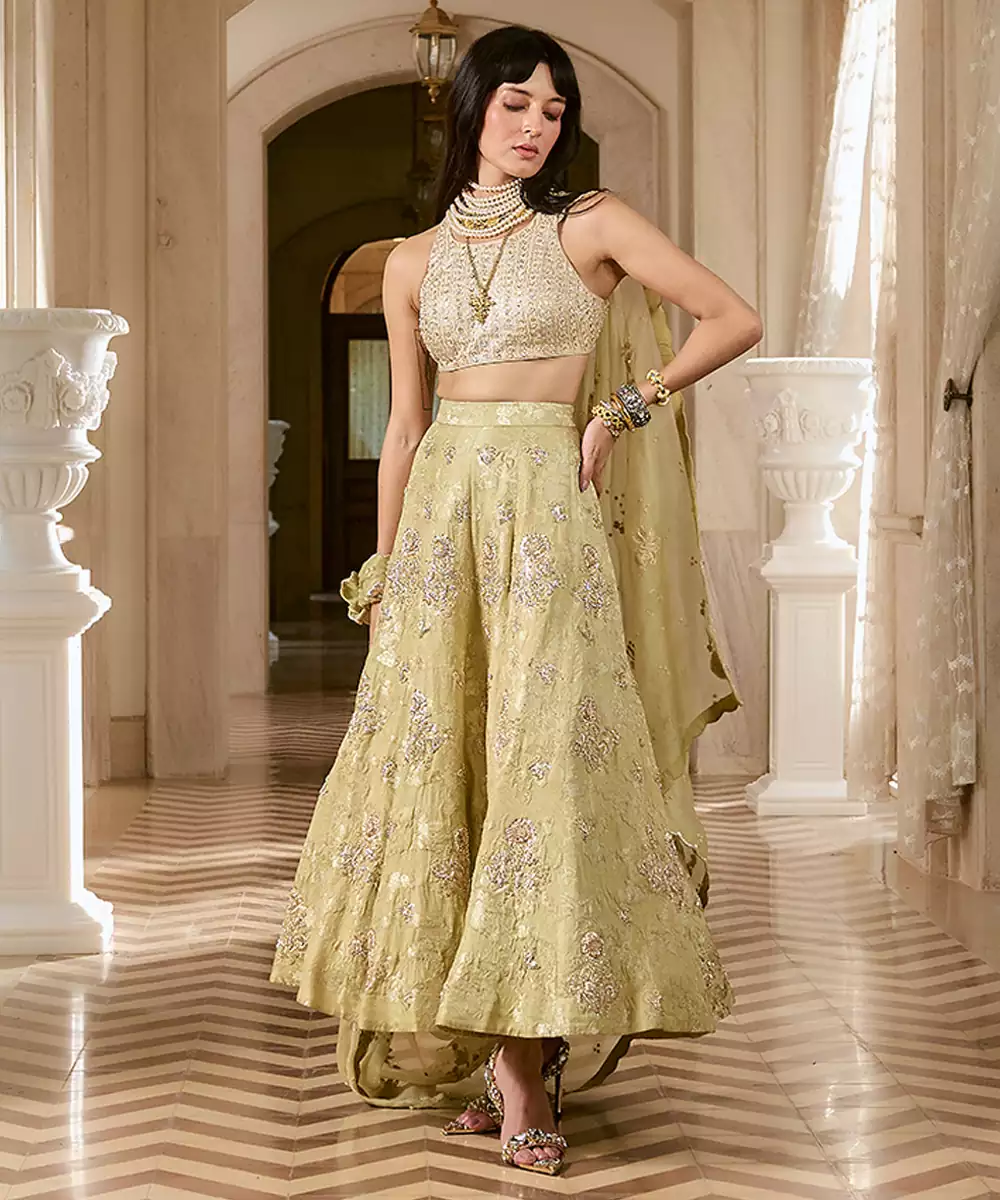 A Pistache Skirt Crafted In Lustrous Silver Jacquard, Featuring An Ivory Blouse With Mirrorwork. The Skirt Mirrors This Opulence, Embellished Throughout With Delicate Zardozi Work That Enhances Its Graceful Silhouette. Paired With A Sheer Organza Dupatta, Finished With Scalloped Edges And Embroidered Borders, And Dotted With Delicate Buttis, This Ensemble Seamlessly Blends Traditional Craftsmanship With Contemporary Design.