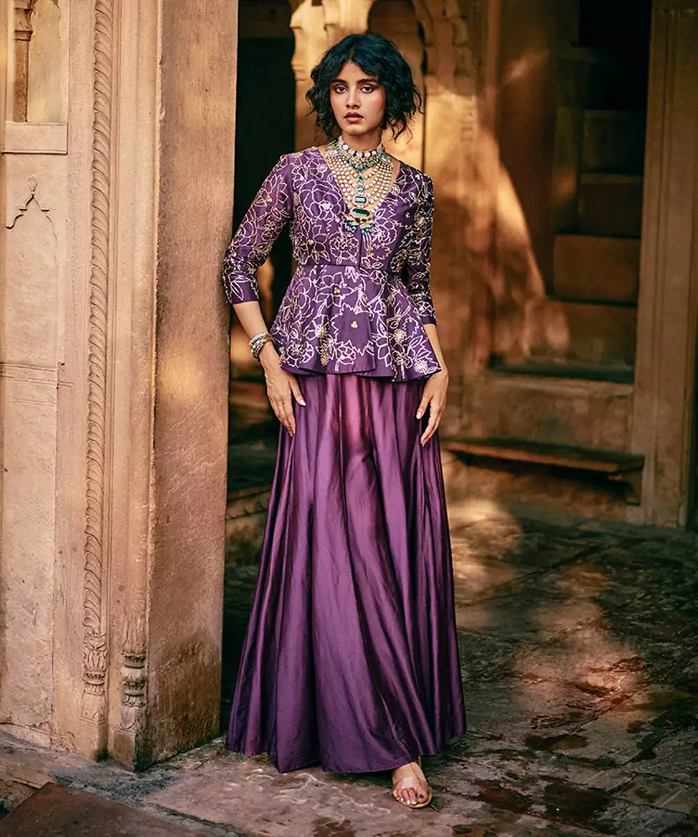 A Plum Vintage Style Peplum, Evoking An Old World Charm In Delicate Pita Hand Embroidery In Floral Motifs, Paired With Solid Palazzos.