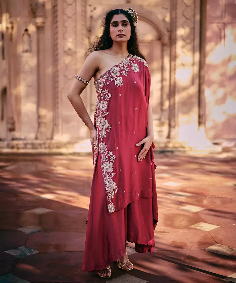 Our One Shoulder Top With Asymmetrical Palazzo Strikes A Statement. Elevated With Floral Embroidery Using The Mixed Technique Of Zardozi And Aari Is Perfect For Celebrations.