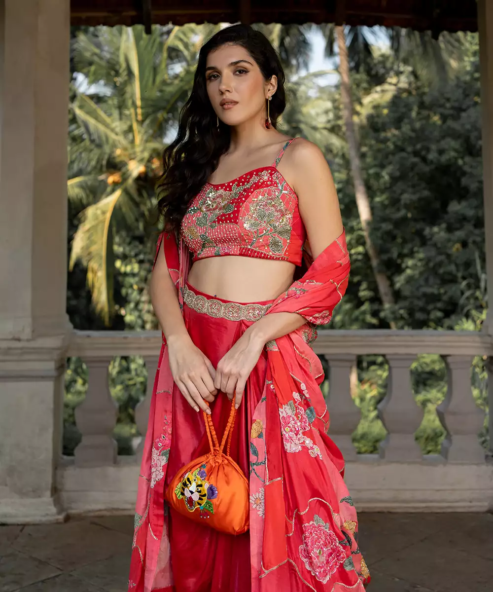 Featuring A Nasha Printed Blouse That Is Embroidered Using Mirrror, Resham Thread , Cutdana, Moti, Sequins Paired With An Embroidered Jacket , Satin Pre Drape Skirt And Belt.