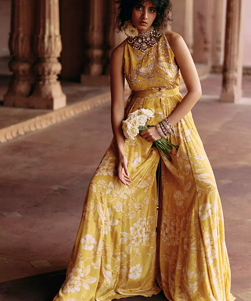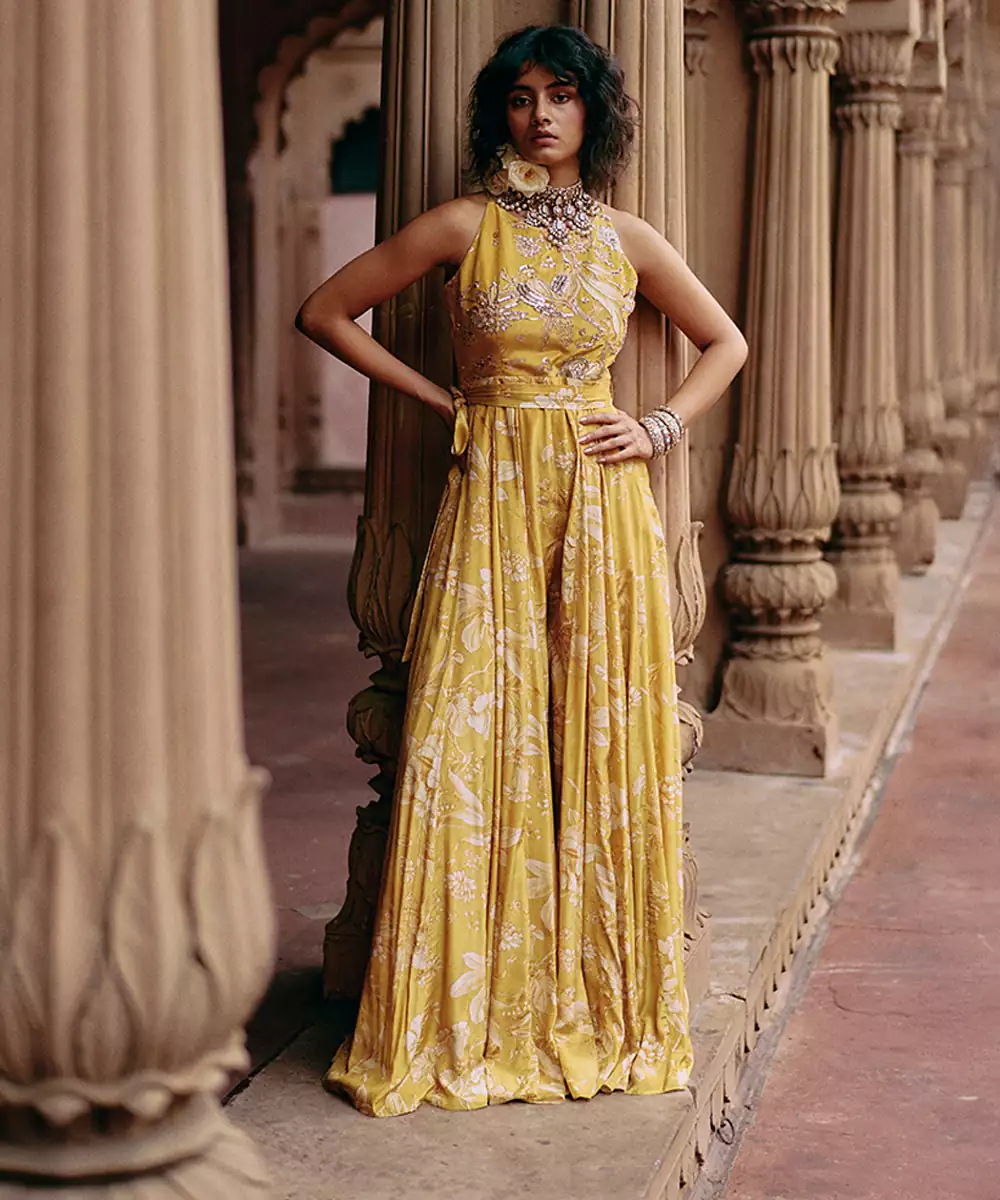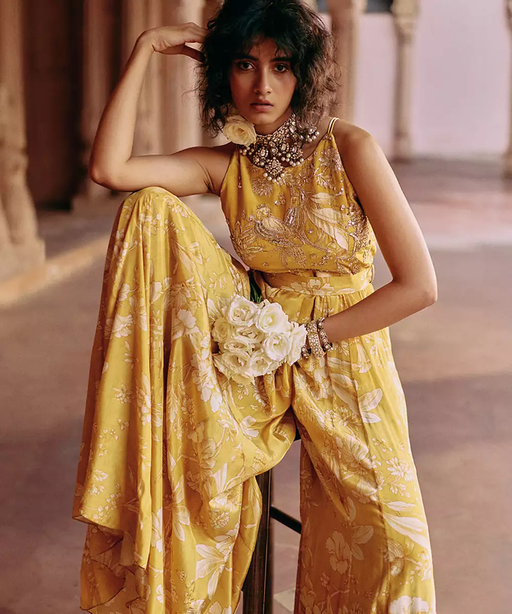 A Tuscany Yellow Jumpsuit Featuring Our Signature Roop Flip Bird Print, Featuring A Pair Of Birds In Their Enchanting Habitat. The Print Is Enhanced With Hand Embroidery In Zardozi And Aari Work And The Look Is Complete With A Printed Belt.