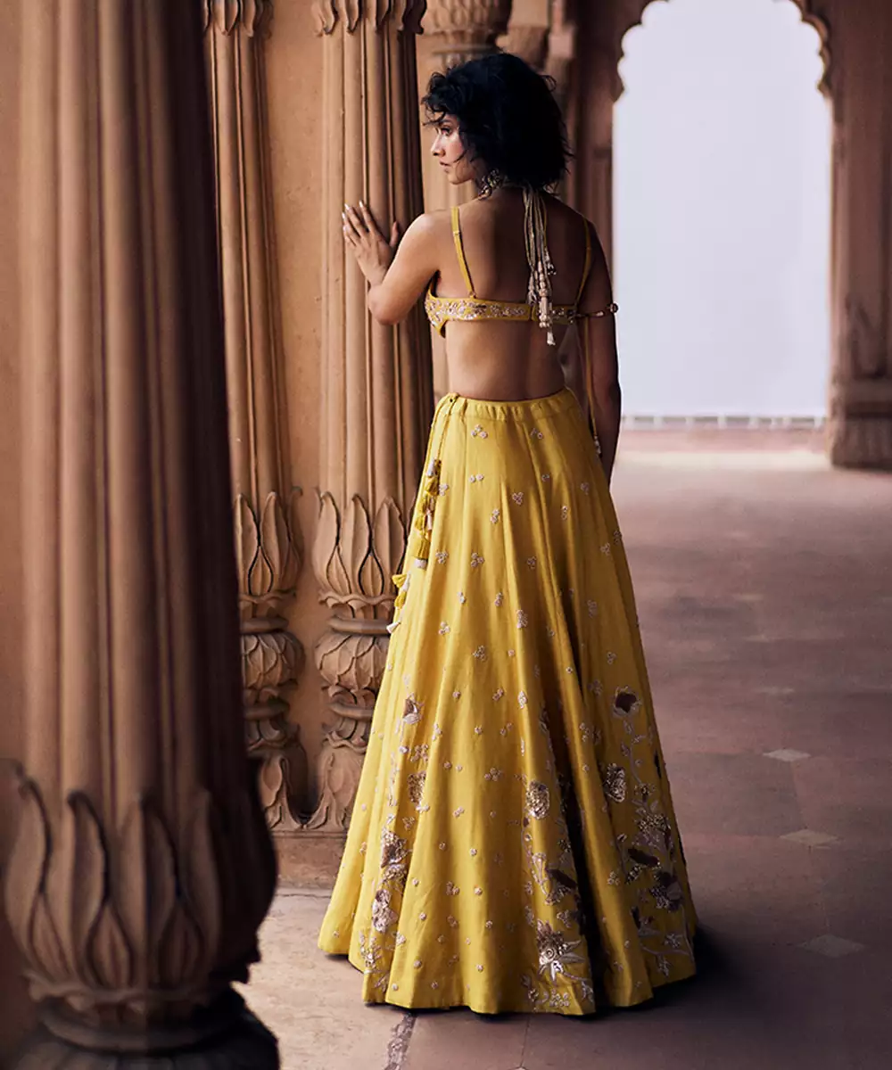 A Tuscany Yellow Hand Embroidered Lehenga Set, Featuring Ornate Aari And Zardozi Embroidery, In Alternating Kalis Of Chintz And Small Floral Buttis. It Is Paired With A Hand Embroidered Dupatta, Featuring Floral Bunches And Double Scallop Embroidered Borders.