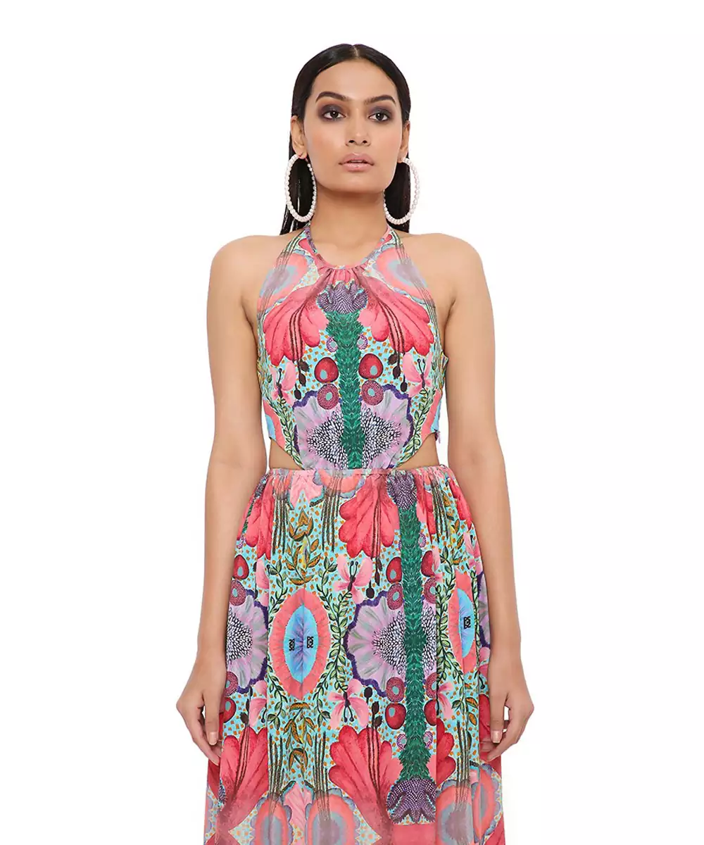Red Enchanted Print Crepe Waist Cut Out Dress.