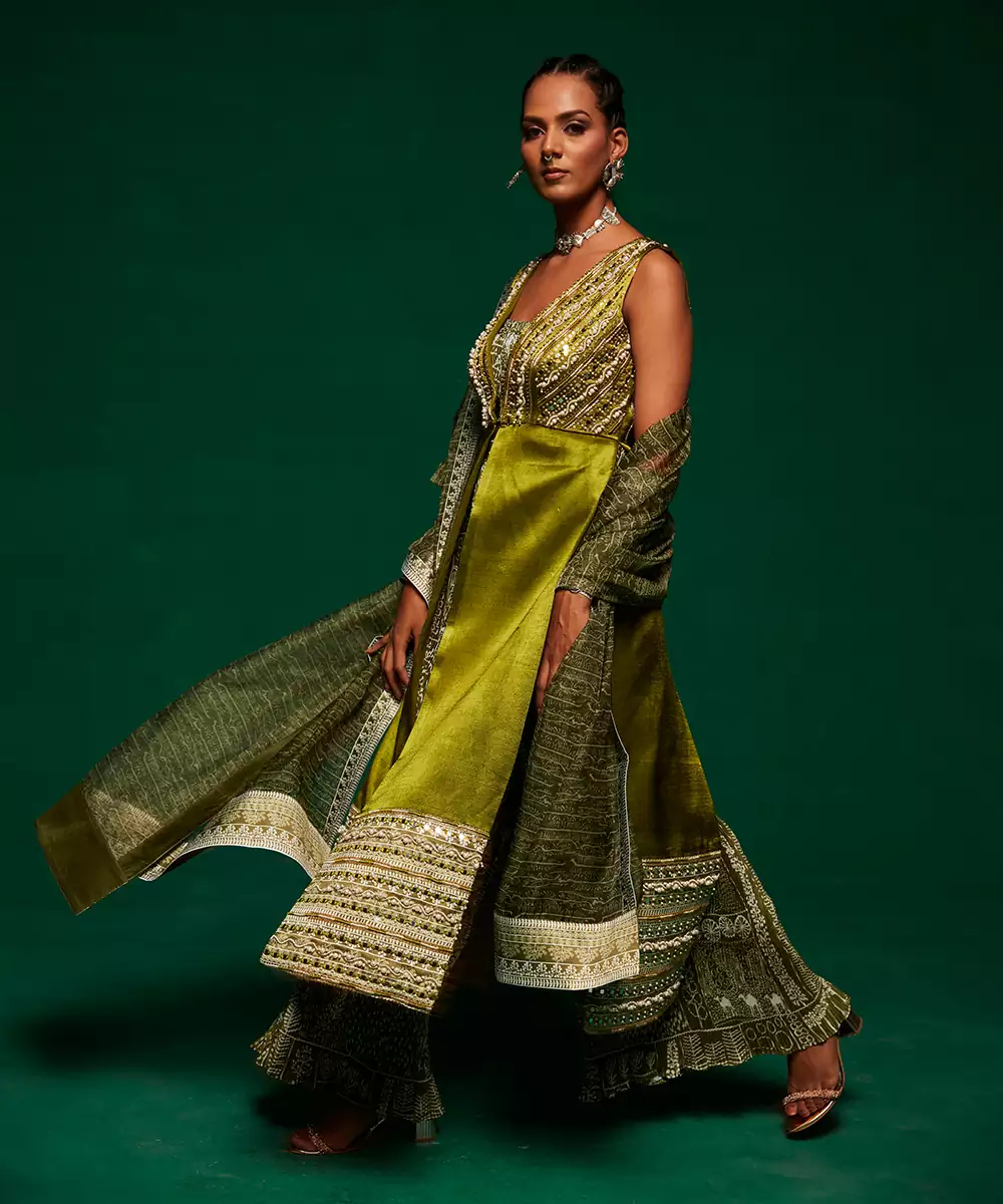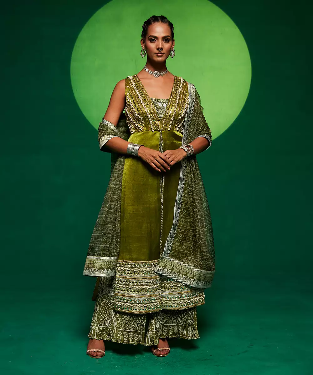 Olive Green Embroidered Jute Jacket With Kurta & Pant