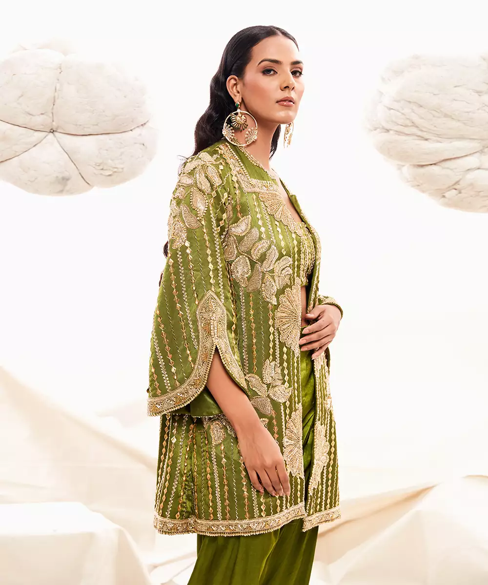 Olive Green Jacket With Sequin, Cutdana, Glass Bead Embroidery In Floral Pattern. Paired With Stripe Embroidered Padded Bustier & Dhoti Pant. Colour : Olive Green Fabric : Silk Components : 3 (Bustier,Dhoti Pant,Jacket) Work : Embroidered