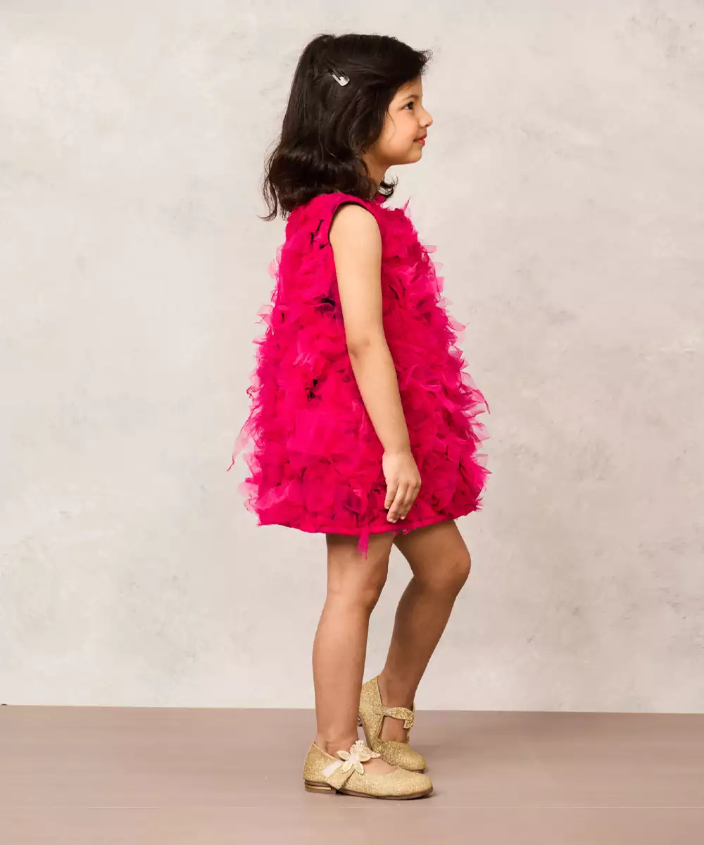 Soft, Fluffy Pink Net Fabric For A Delicate And Dreamy Look. A Line Silhouette For A Flattering Fit. Feminine Ruffle Details That Add Texture And Style. Ideal For Special Occasions, Parties, And Formal Events