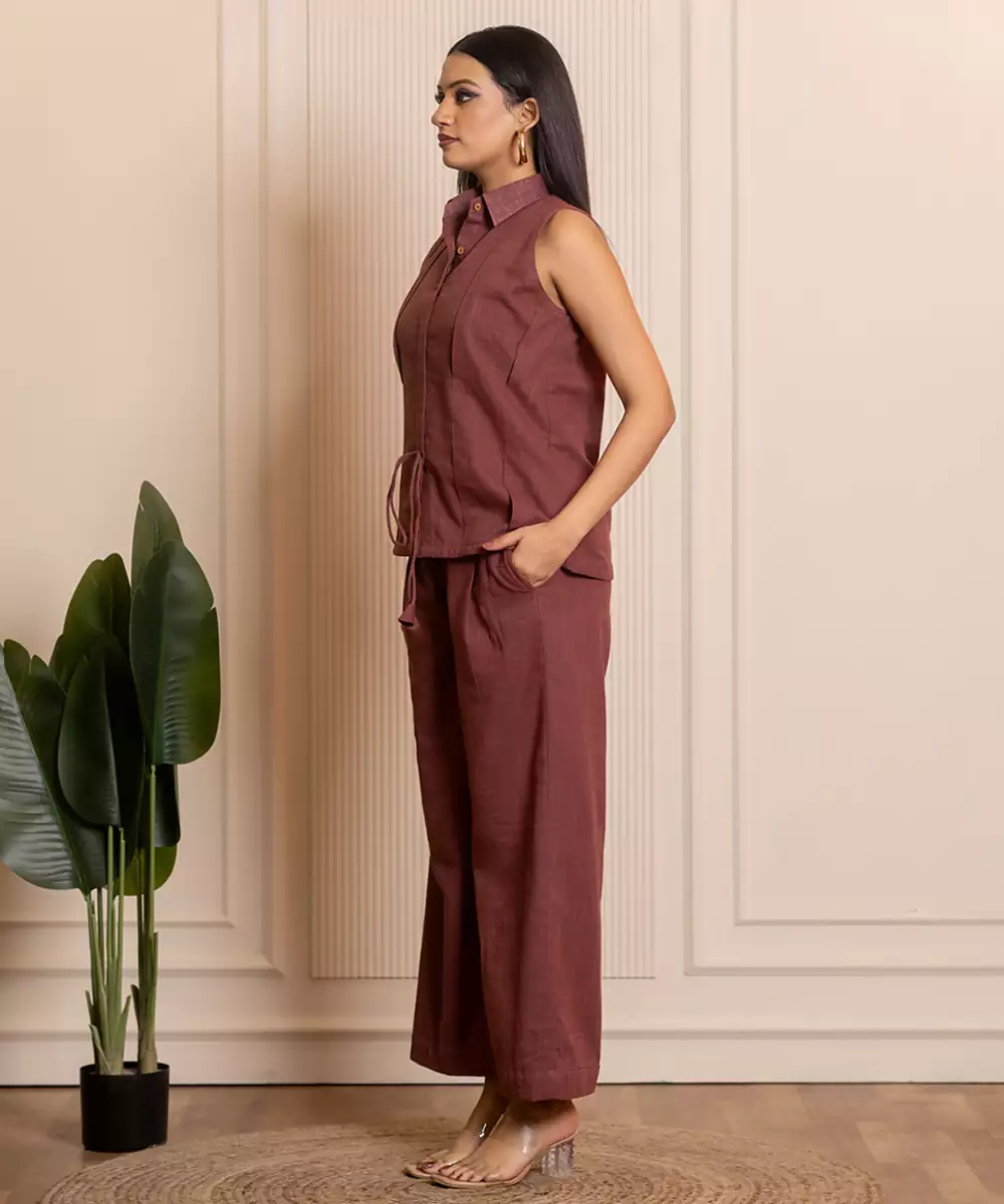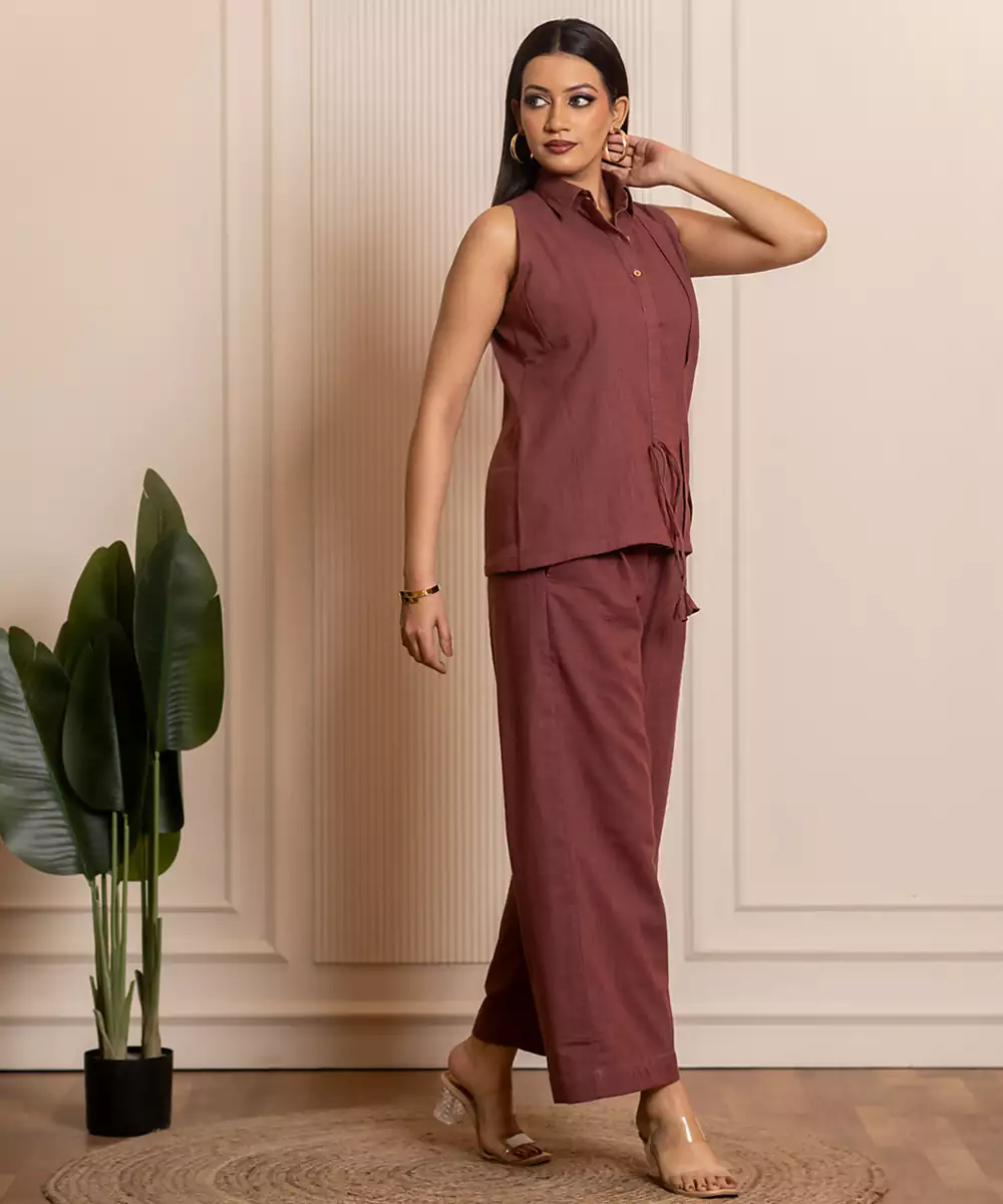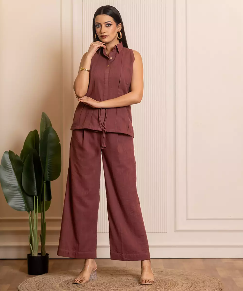 This Brown Woven Cotton Co Ord Set Offers A Perfect Blend Of Comfort And Traditional Charm. Crafted From Breathable Cotton Fabric With Subtle Woven Detailing, It Features A Coordinated Top And Bottom For A Complete Look. Ideal For Casual Outings, Festive Mornings, And Everyday Ethnic Wear.