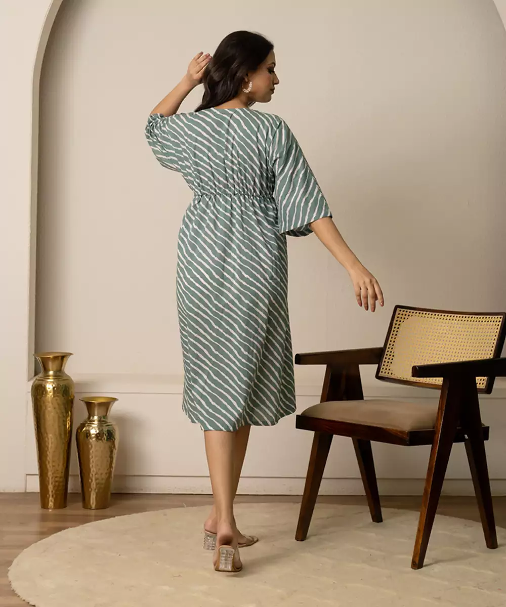 This Green Printed Cotton Kaftan Offers A Relaxed Silhouette With Vibrant Prints On Breathable Cotton Fabric. Designed For Comfort And Style, It Is Perfect For Casual Lounging, Festive Mornings, And Resort Inspired Ethnic Wear With Effortless Grace.