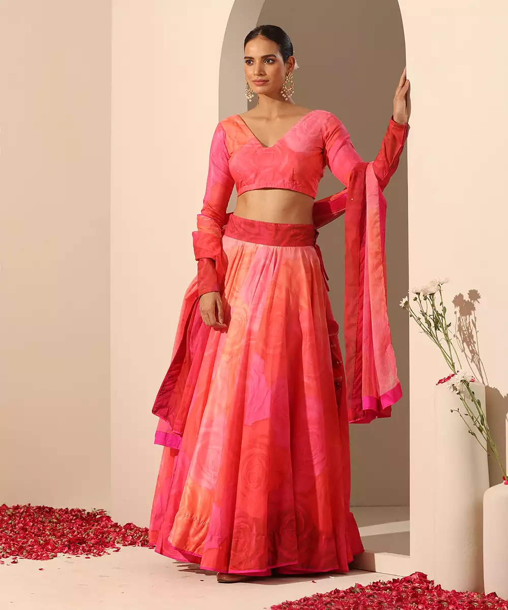 Floral Printed Lehenga Is Paired With A Matching Blouse Featuring Full Sleeves, V Neckline & Tassels Tie Up At The Back And A Duppata.