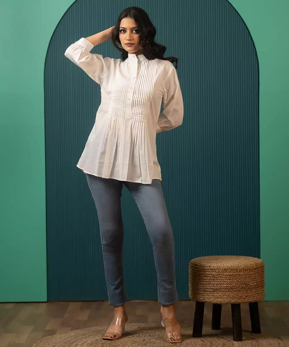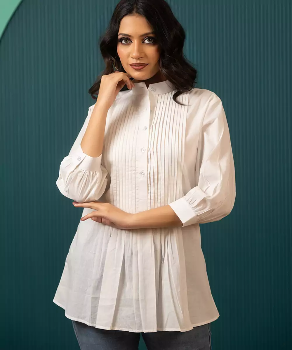 This Ivory Woven Cotton Top Highlights Subtle Woven Textures On Breathable Cotton Fabric. Designed For Comfort And Elegance, It Pairs Well With Trousers Or Skirts For Casual Outings, Festive Lunches, And Refined Everyday Ethnic Wear.
