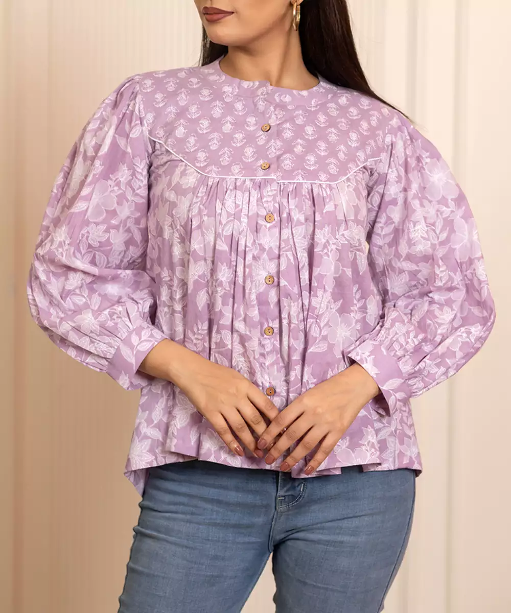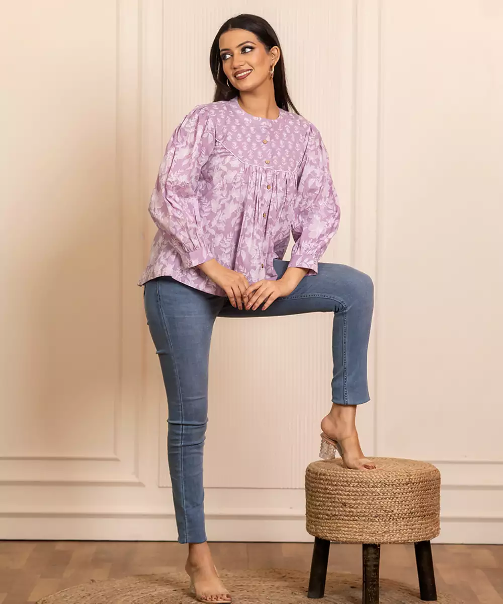 This Lavender Printed Cotton Top Adds A Soothing Tone To Your Ethnic Wardrobe. Made From Soft Cotton Fabric, It Features Graceful Prints And A Comfortable Fit. Ideal For Casual Outings, Daytime Celebrations, And Everyday Wear With Subtle Charm.
