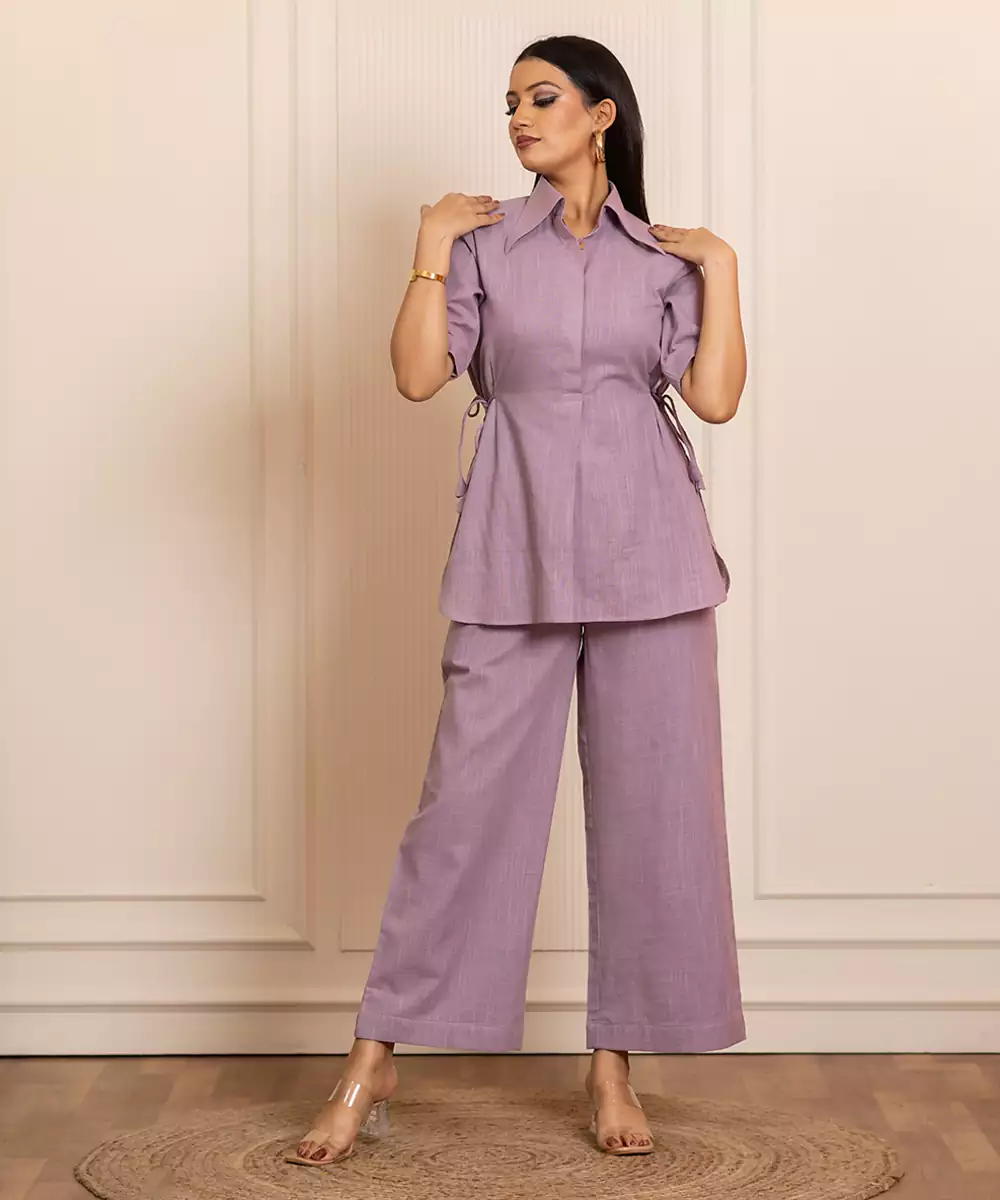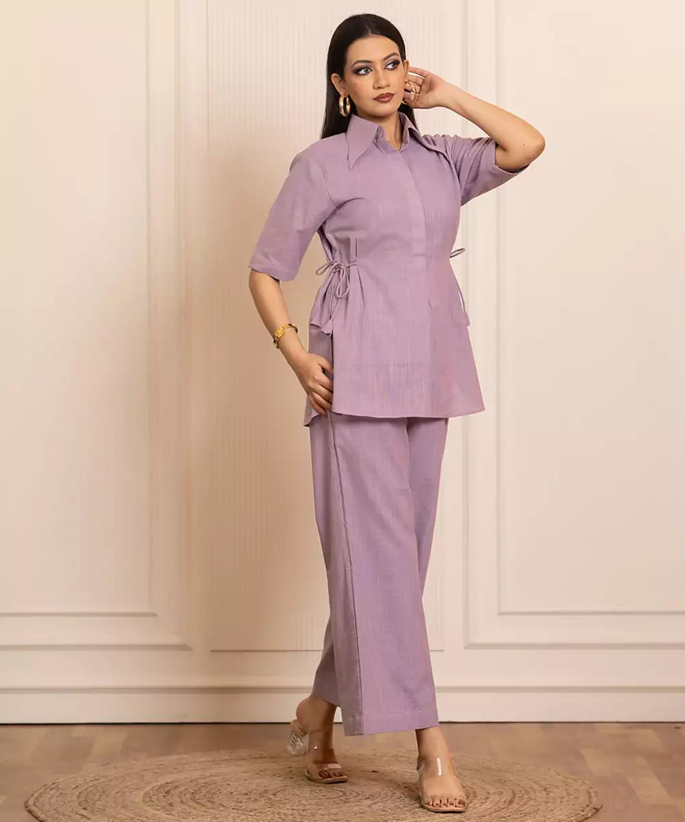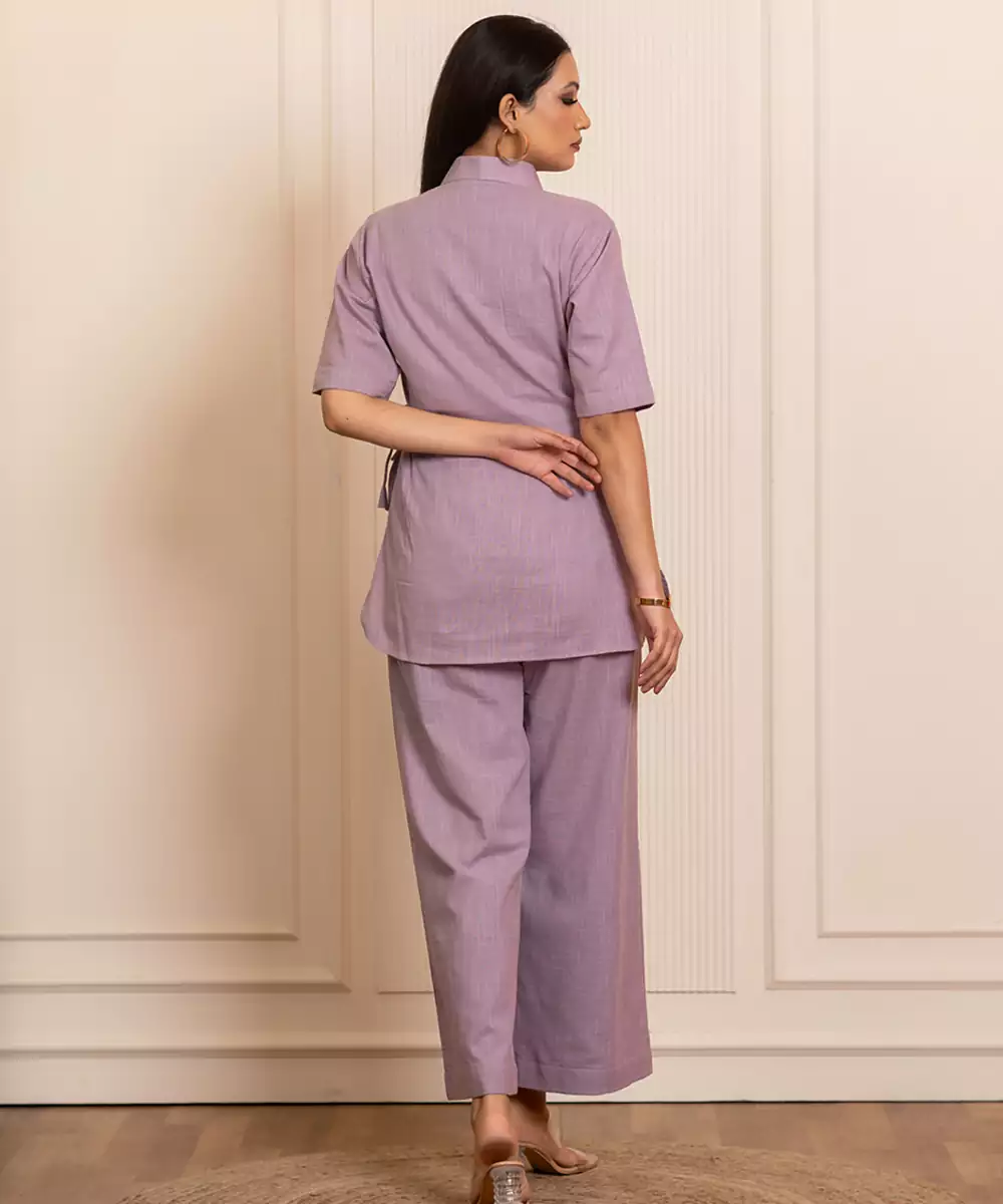 This Lavender Woven Cotton Co Ord Set Blends Soothing Color With Traditional Weaving Techniques. Made From Breathable Cotton, It Features A Relaxed Yet Refined Silhouette. Perfect For Casual Celebrations, Daytime Functions, Or Resort Inspired Ethnic Looks, It Offers Elegance With Everyday Comfort And Versatility.