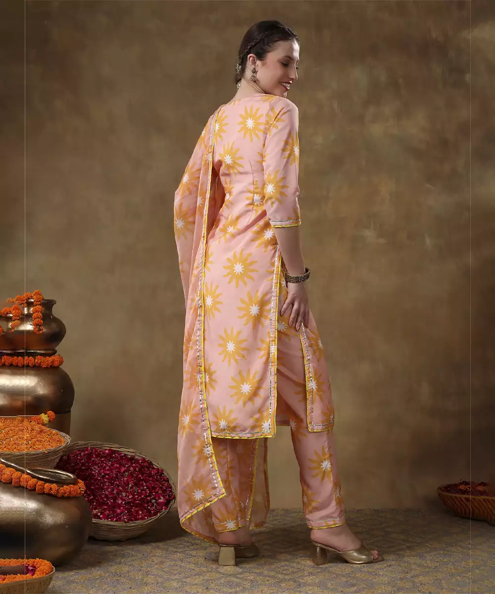 Meraki Naila Peach Muslin Printed Kurta Set With Organza Dupatta Colour: Peach Fabric: Muslin Components : 1 Kurta / 1 Pant / 1 Dupatta