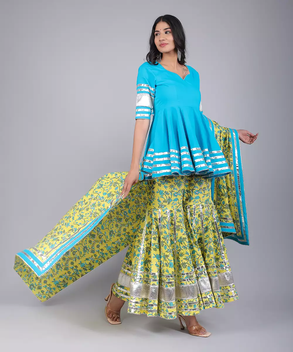 Featuring A Lace Work Peplum Kurta Paired With Lace Work Printed Sharara And Dupatta.