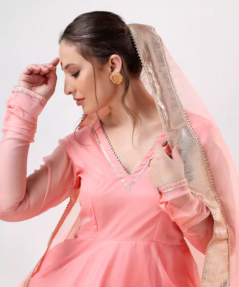 Sadabhar Peach Organza Gotta Work Anarkali Set Colour: Peach Fabric: Organza Components: 3 ( Anarkali , Pants , Dupatta ) Work: Plain