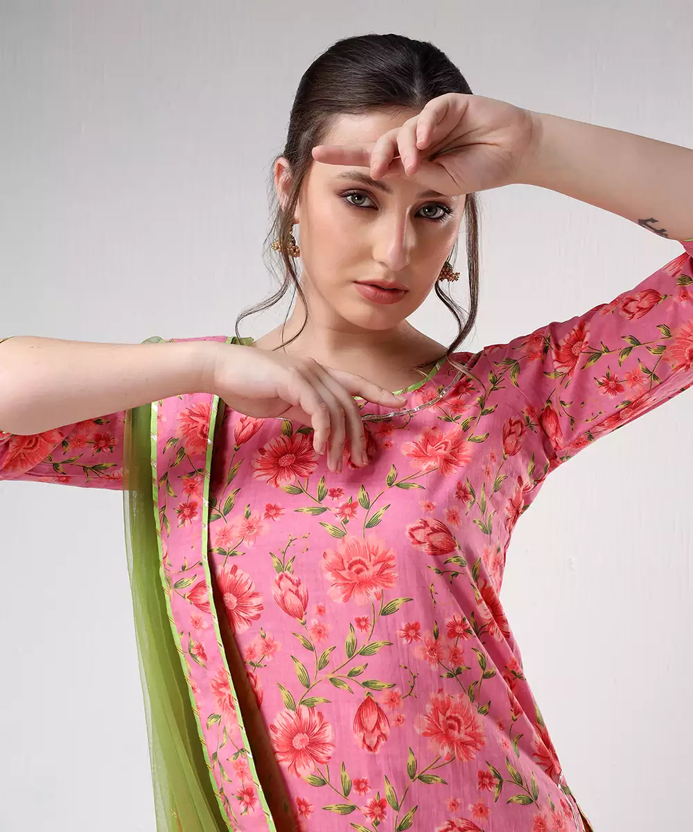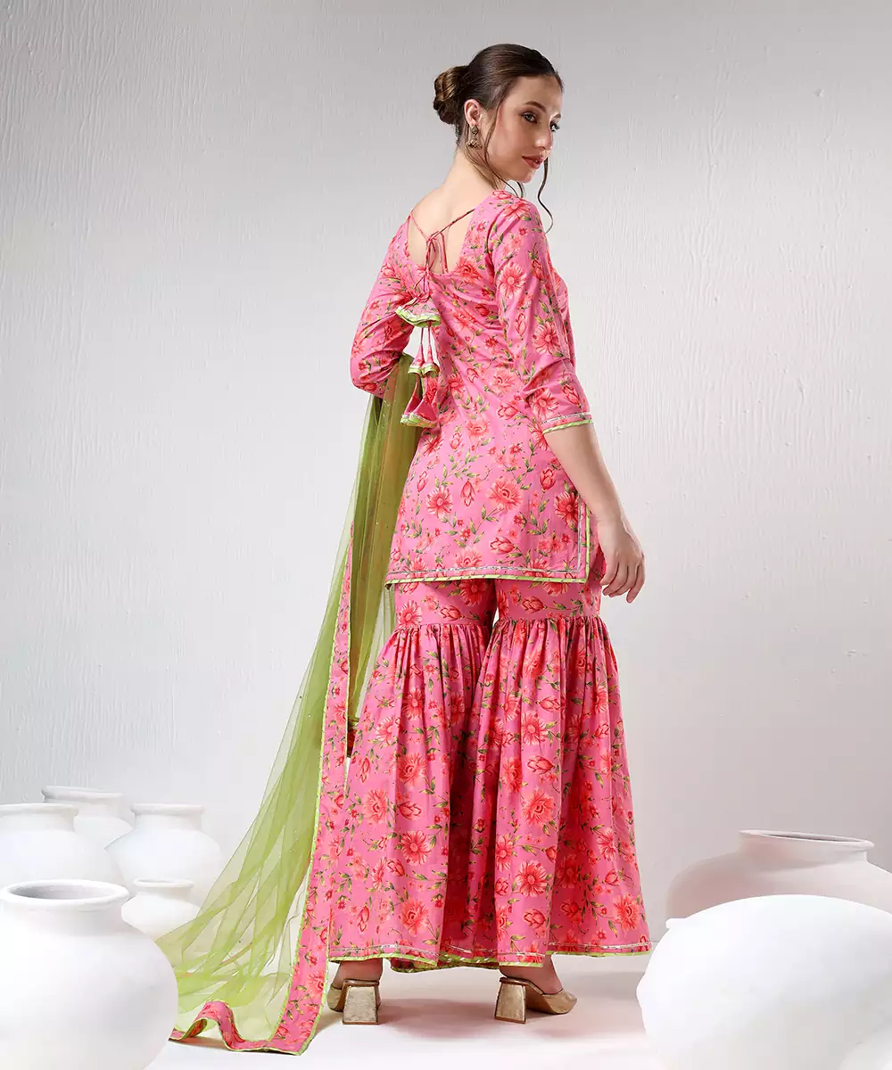 Sadabhar Pink Floral Print Cotton Sharara Set Colour: Pink Fabric: Cotton Components: 3 ( Kurta ,Sharara,Dupatta ) Work: Printed