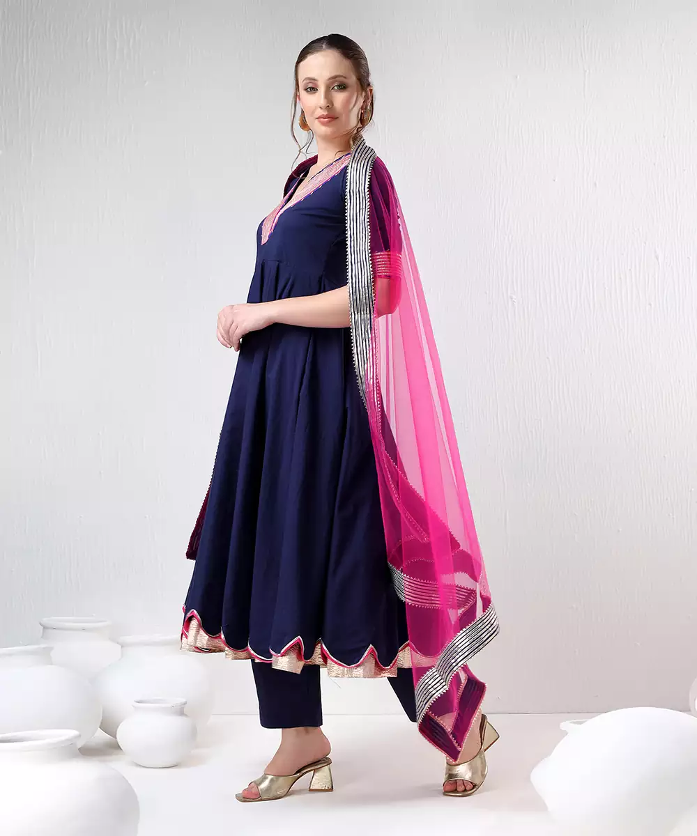 Sadabhar Royal Blue Raani Pink Cotton Silk Anarkali Set Colour: Royal Blue Raani Pink Fabric: Cotton Silk Components: 3 ( Anarkali , Pants , Dupatta ) Work: Printed