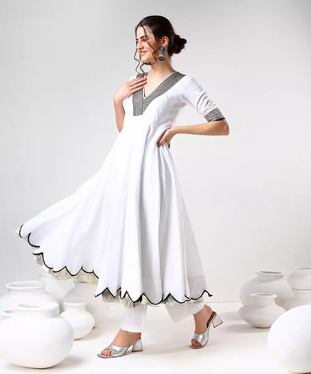 Sadabhar White And Black Cotton Anarkali Set Colour: White And Black Fabric: Cotton Components: 3 ( Anarkali , Pants , Dupatta ) Work: Plain