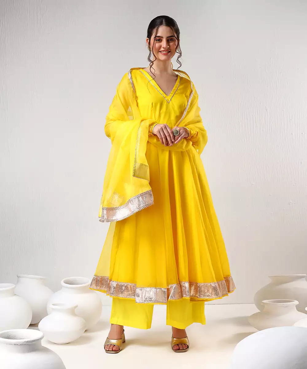 Sadabhar Yellow Organza Gotta Work Anarkali Set Colour: Yellow Fabric: Organza Components: 3 ( Anarkali , Pants , Dupatta ) Work: Plain