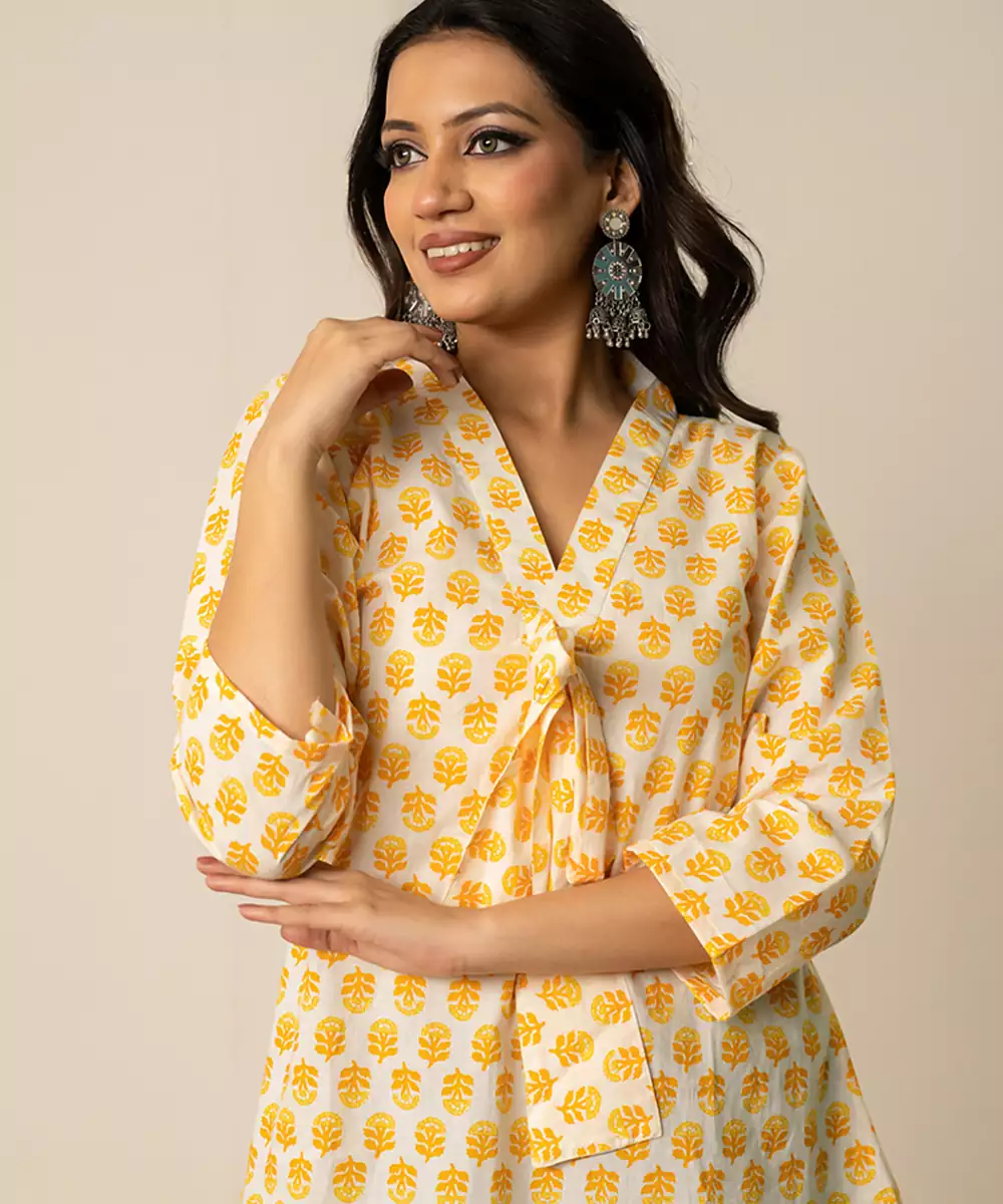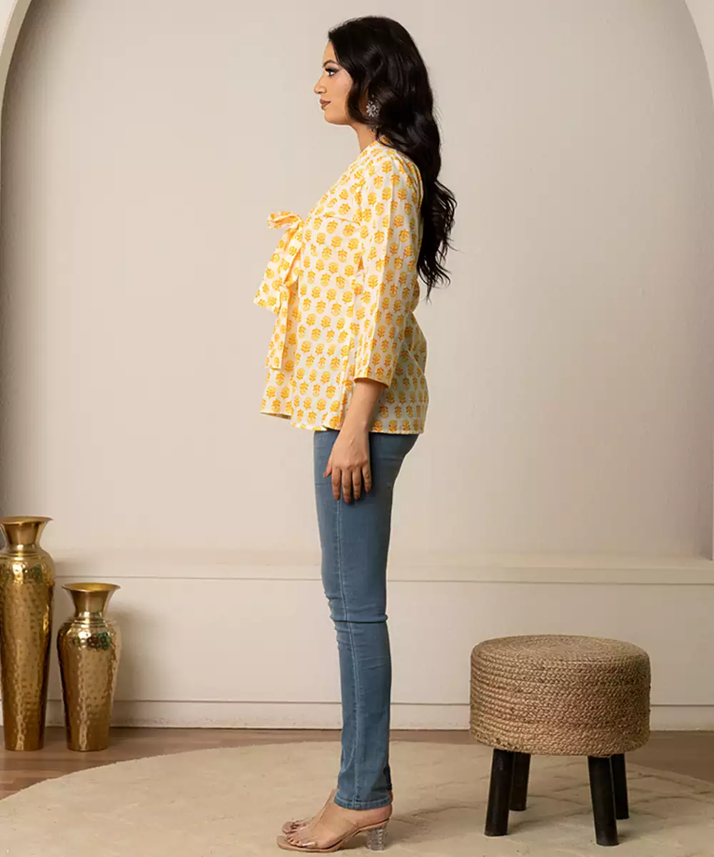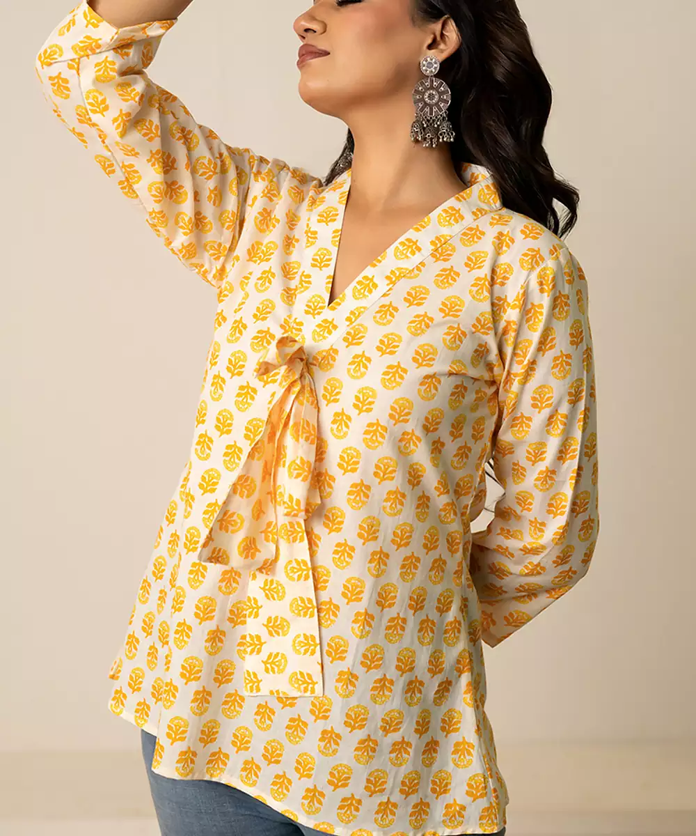 This Yellow Printed Cotton Top Adds Brightness And Cheer To Your Wardrobe. Crafted From Breathable Cotton Fabric, It Features Lively Prints And A Comfortable Silhouette. Ideal For Casual Outings, Festive Lunches, And Daytime Wear With Vibrant Charm.