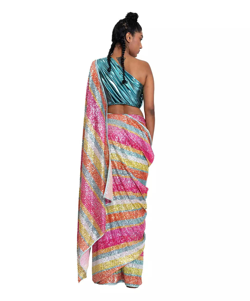 Pre Stitched Striped Sequin Saree With Metallic One Shouldered Blouse.