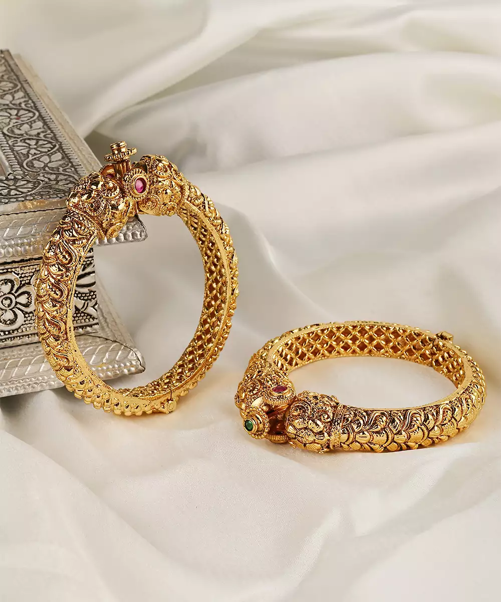 This Gold Plated Kundan Bangle Showcases Timeless Elegance And Traditional Craftsmanship. Adorned With Intricate Kundan Detailing And A Radiant Gold Finish, It Adds A Regal Touch. Perfect For Weddings And Festive Occasions, It Beautifully Enhances Ethnic Ensembles With Refined Sophistication.