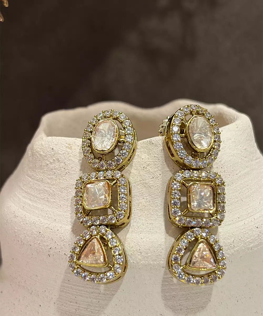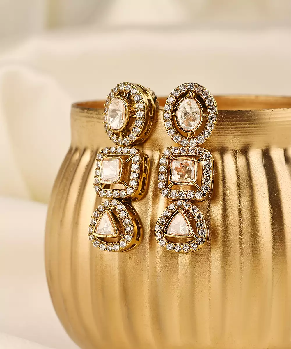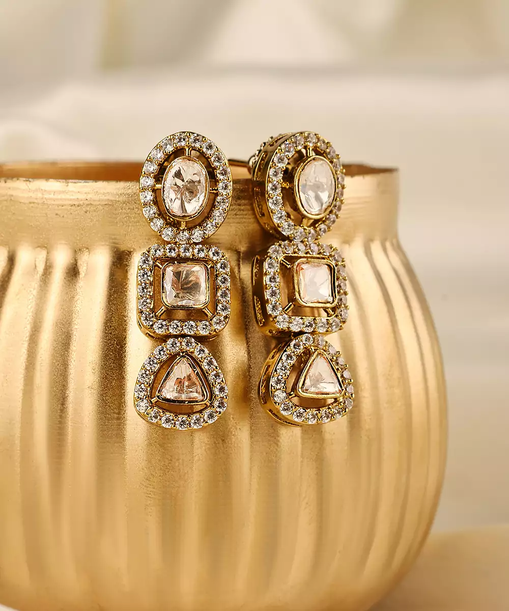 These Gold Plated Kundan Dangler Earrings Exude Timeless Elegance And Traditional Charm. Crafted With Intricate Kundan Detailing And A Radiant Gold Finish, They Add Graceful Movement And A Regal Touch. Perfect For Weddings And Festive Occasions, They Beautifully Enhance Ethnic Looks With Refined Sophistication.