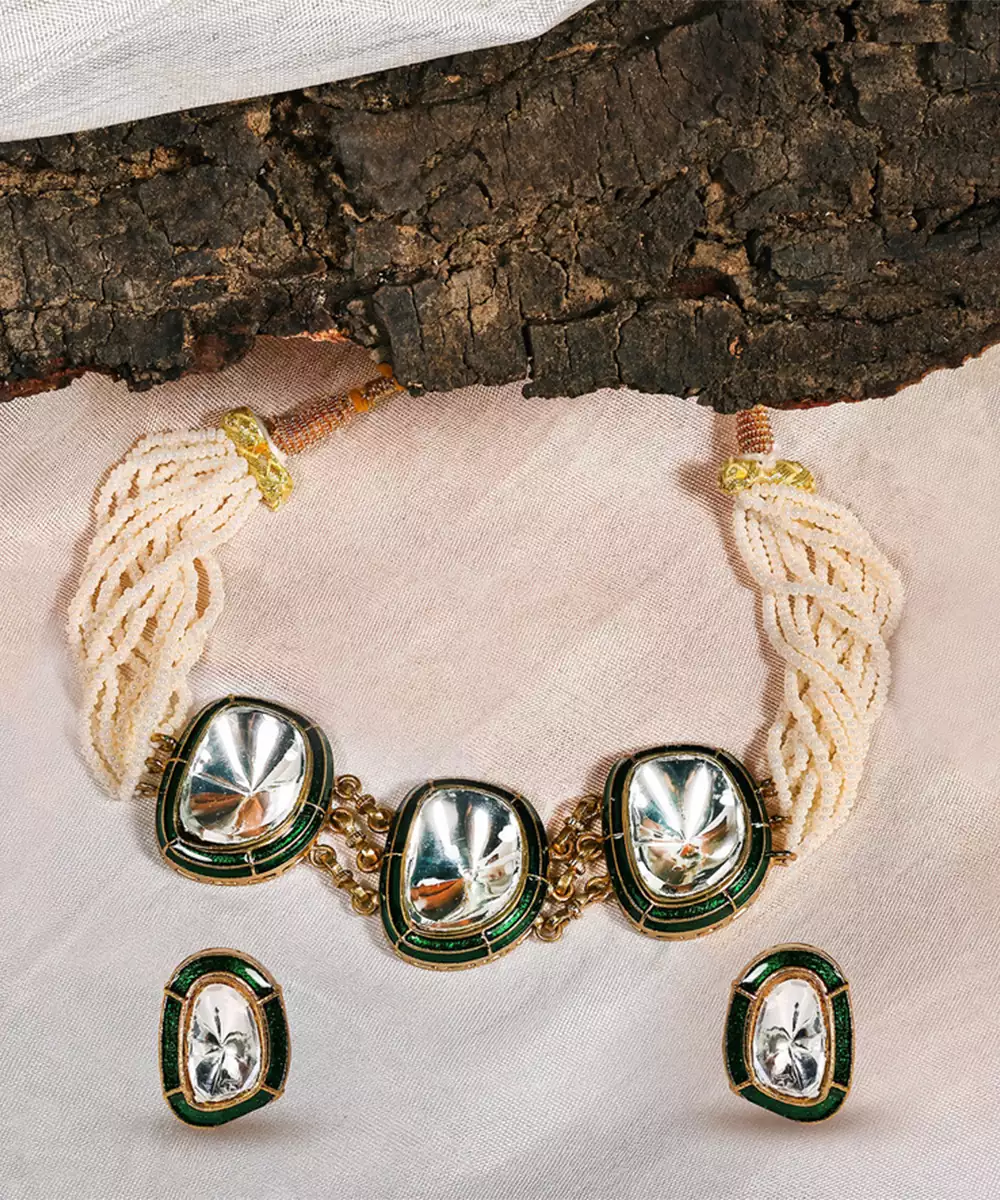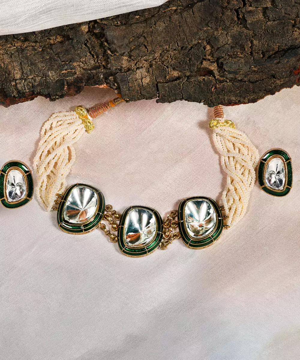 This Gold Plated Kundan Green Enamel Choker Necklace Set Showcases Regal Elegance And Traditional Artistry. Accented With Rich Green Enamel And Intricate Kundan Detailing, It Offers A Luxurious Statement Look. Perfect For Weddings And Festive Occasions, It Beautifully Complements Ethnic Ensembles With Timeless Charm.
