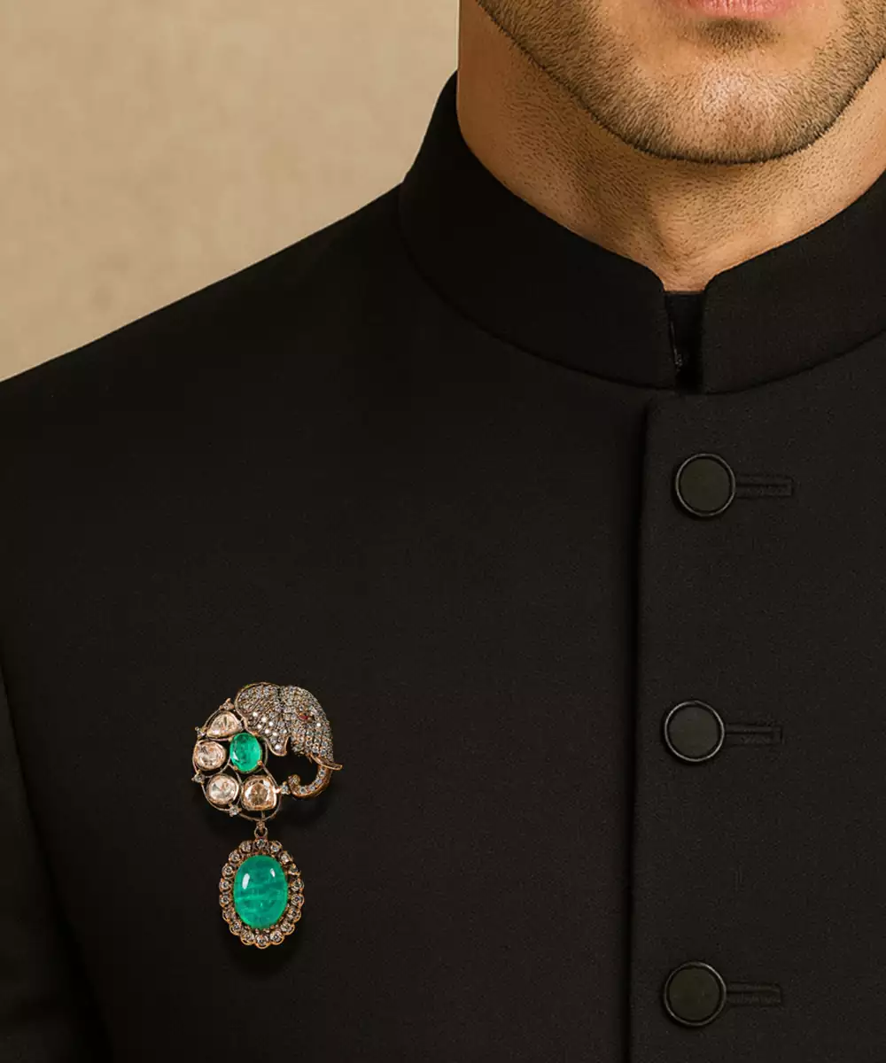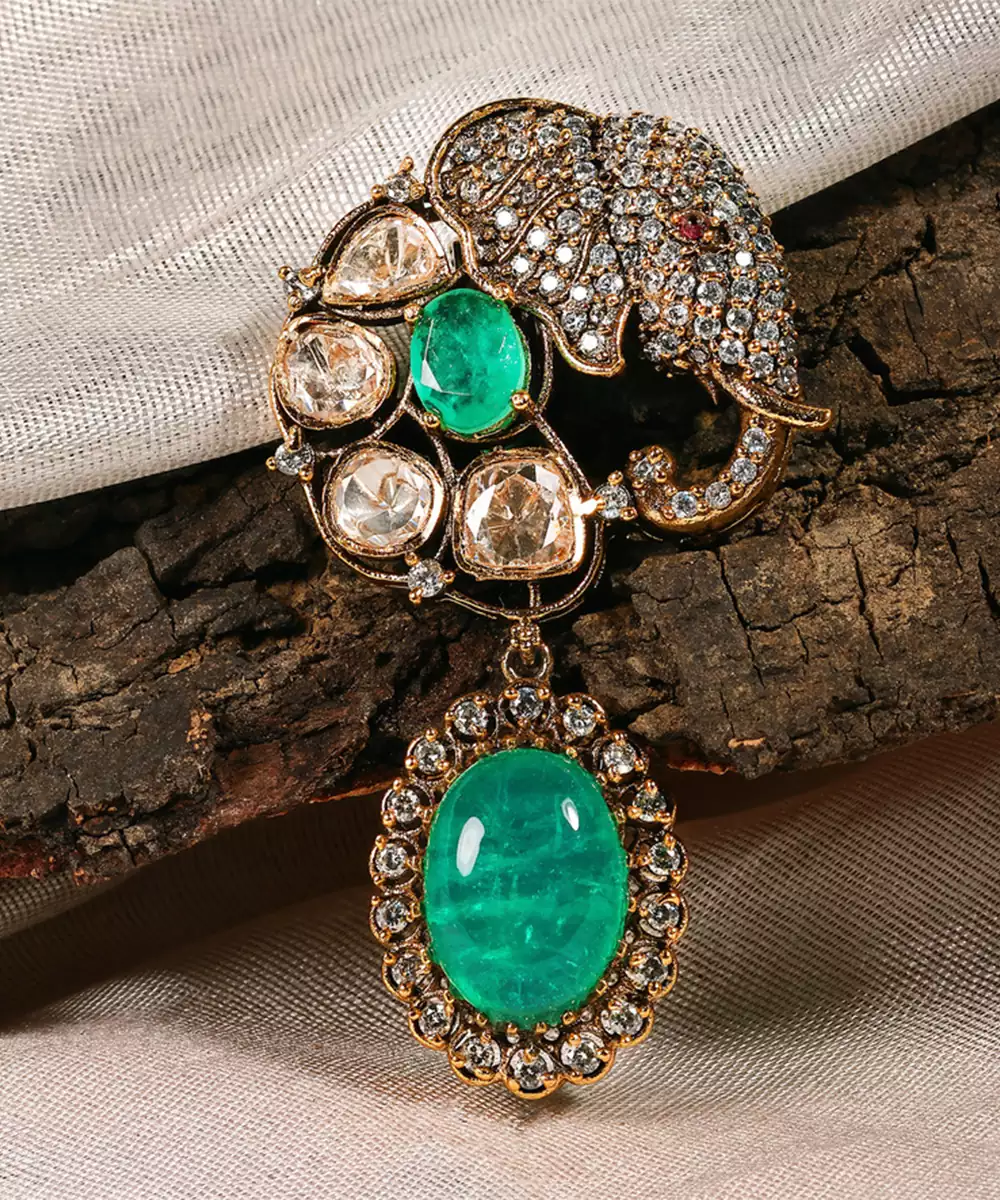 This Gold Plated Kundan Green Stones Brooch Showcases Regal Elegance And Traditional Craftsmanship. Adorned With Vibrant Green Stones And Intricate Kundan Detailing, It Adds A Luxurious Accent. Perfect For Weddings And Festive Occasions, It Elevates Ethnic Attire With Timeless Charm And Refined Sophistication.