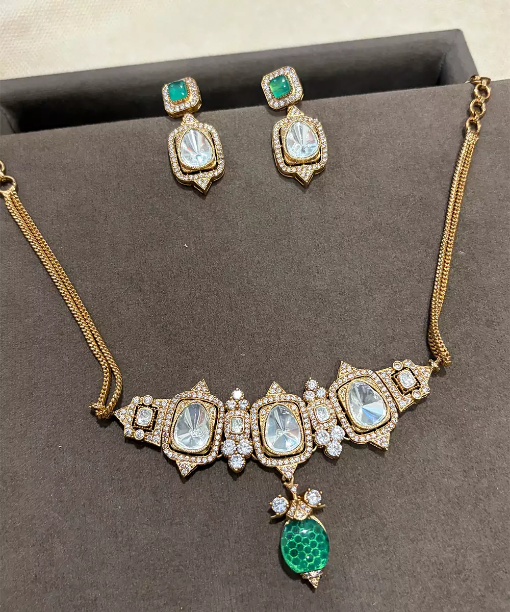 This Gold Plated Kundan Green Stones Necklace Set Exudes Royal Elegance And Traditional Charm. Designed With Intricate Kundan Work And Vibrant Green Stones, It Adds A Luxurious Touch. Perfect For Weddings And Festive Occasions, It Enhances Ethnic Looks With Timeless Beauty And Graceful Sophistication.