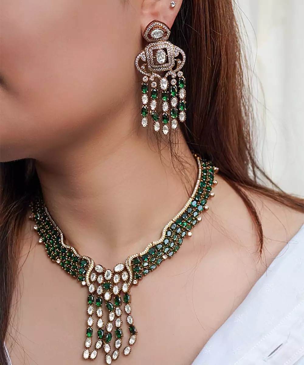 This Gold Plated Kundan Green Stones Necklace Set Exudes Royal Elegance And Traditional Charm. Designed With Intricate Kundan Work And Vibrant Green Stones, It Adds A Luxurious Touch. Perfect For Weddings And Festive Occasions, It Enhances Ethnic Looks With Timeless Beauty And Graceful Sophistication.