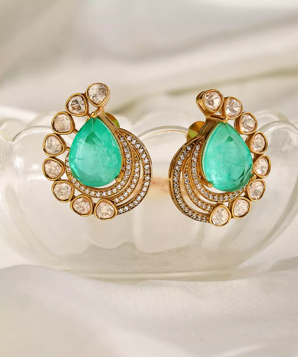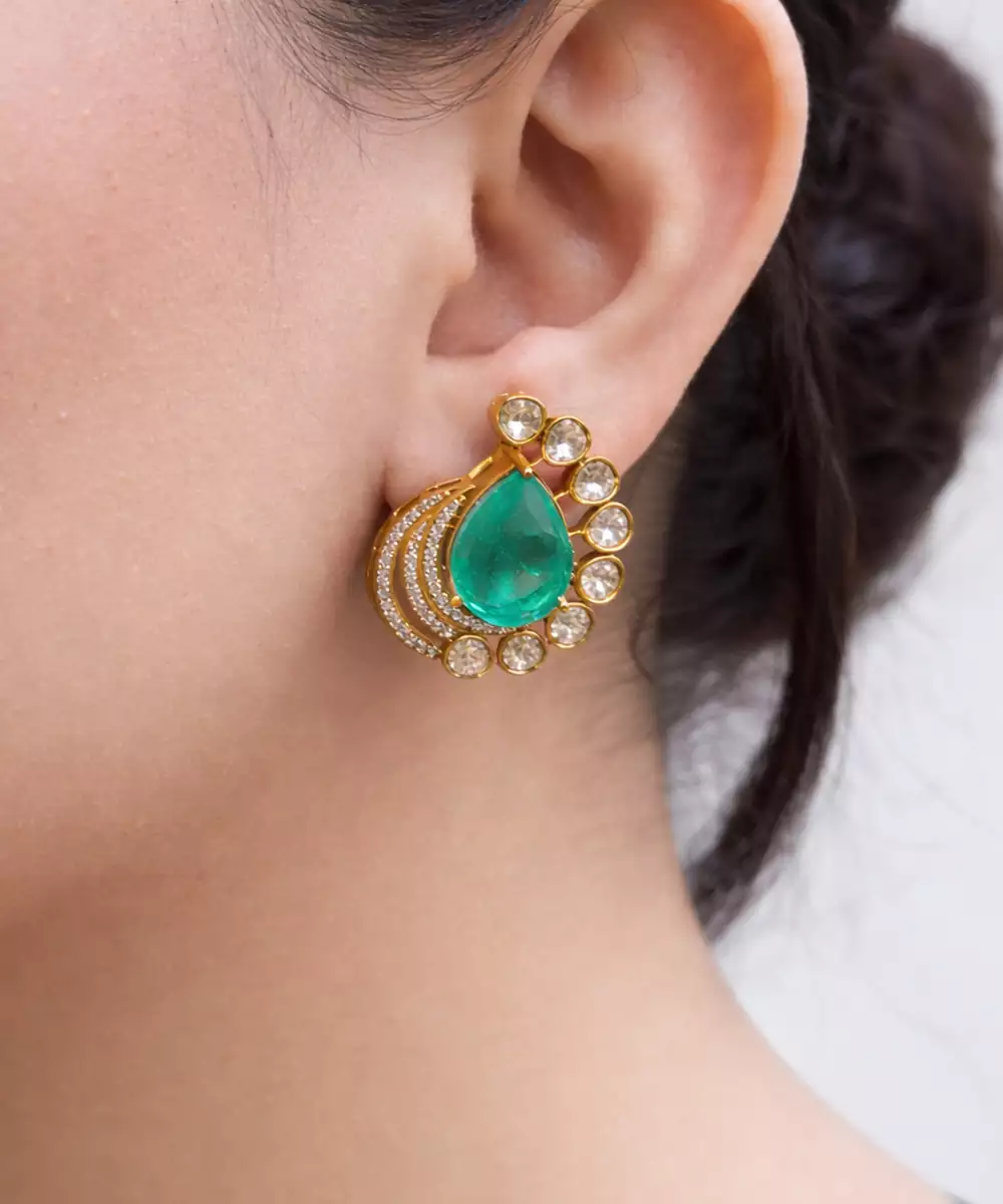 These Gold Plated Kundan Green Stones Stud Earrings Radiate Classic Elegance And Festive Charm. Featuring Intricate Kundan Craftsmanship Accented With Vibrant Green Stones, They Add A Refined Touch. Perfect For Weddings And Celebrations, They Beautifully Enhance Ethnic Ensembles With Timeless Sophistication.